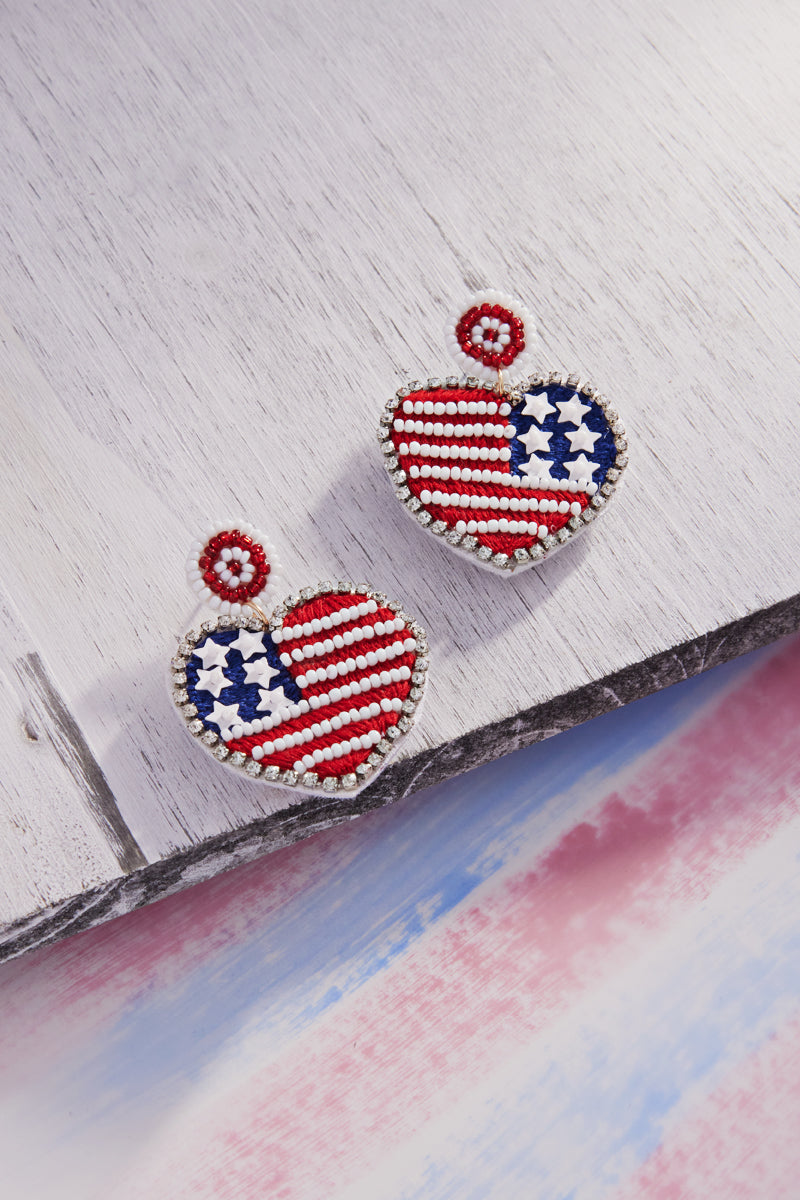 Heart American Flag Patterned Beads Post Earrings