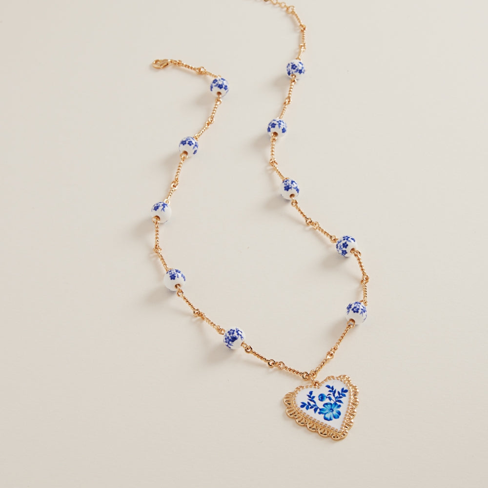 This 16 inch short necklace features a heart-shaped enameled charm with a printed pattern, accented by smooth ceramic beads for a playful yet refined look. Designed to rest near the collarbone, it adds a touch of color and charm to any outfit. Lightweight and easy to style, perfect for everyday wear or layering.