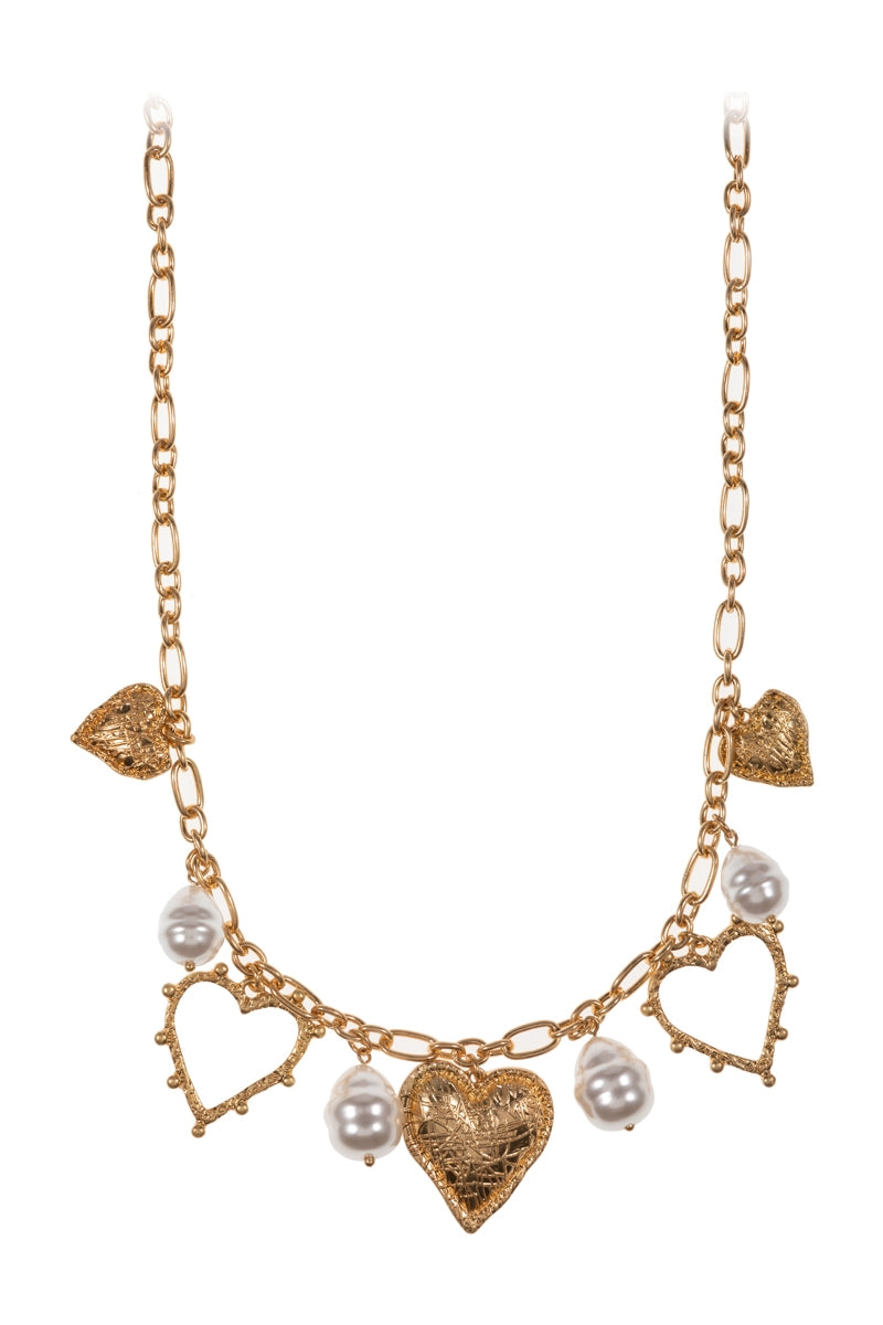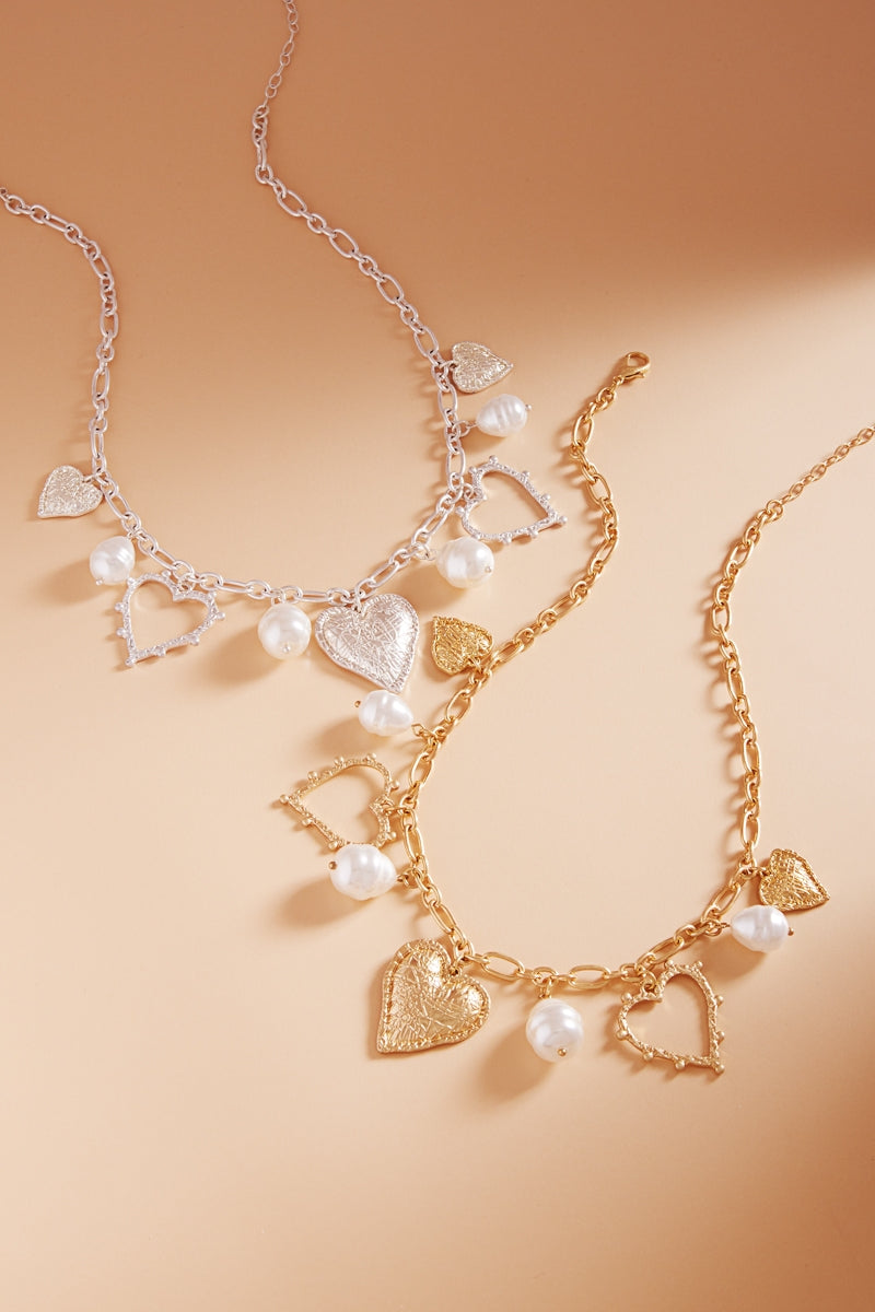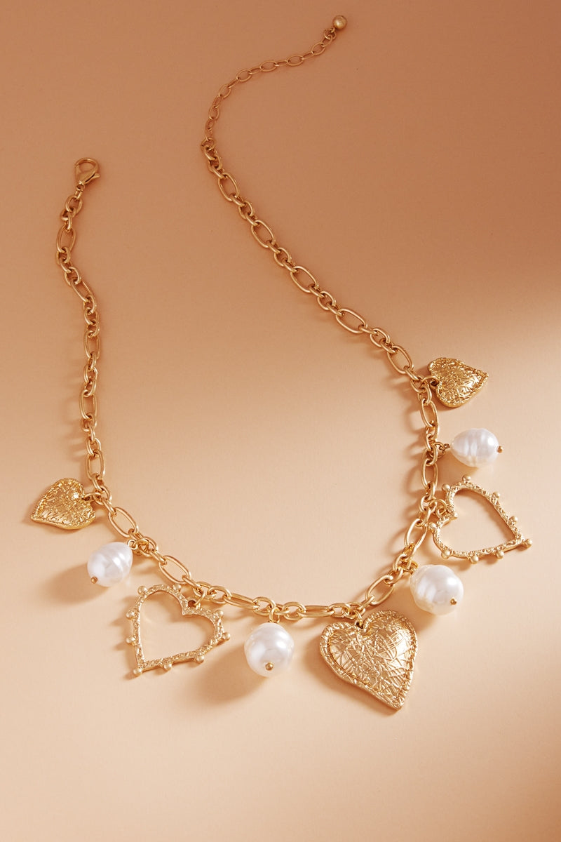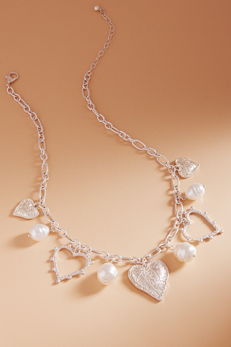 This necklace features a 17 inch multi-heart metal charm with a pearl charm cluster. Add a touch of elegance and sophistication to any outfit with this gorgeous and unique piece. Made with high-quality materials, this short necklace is a must-have for any jewelry collection.