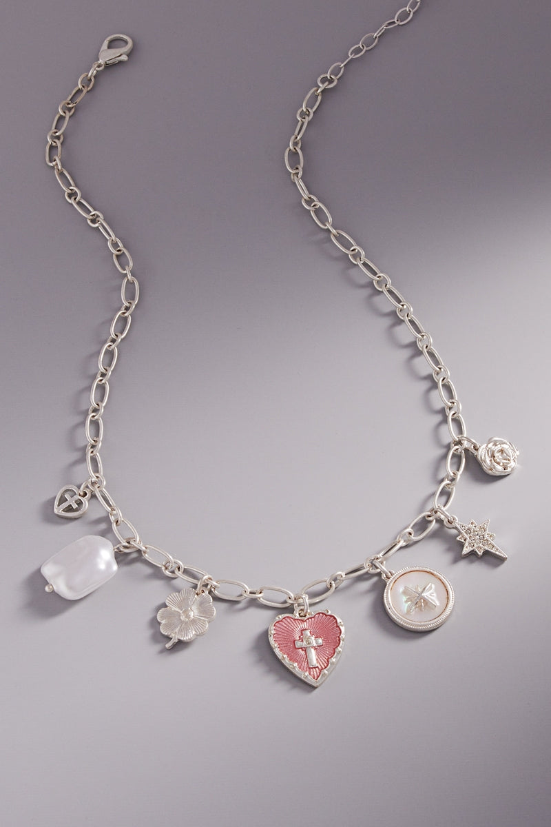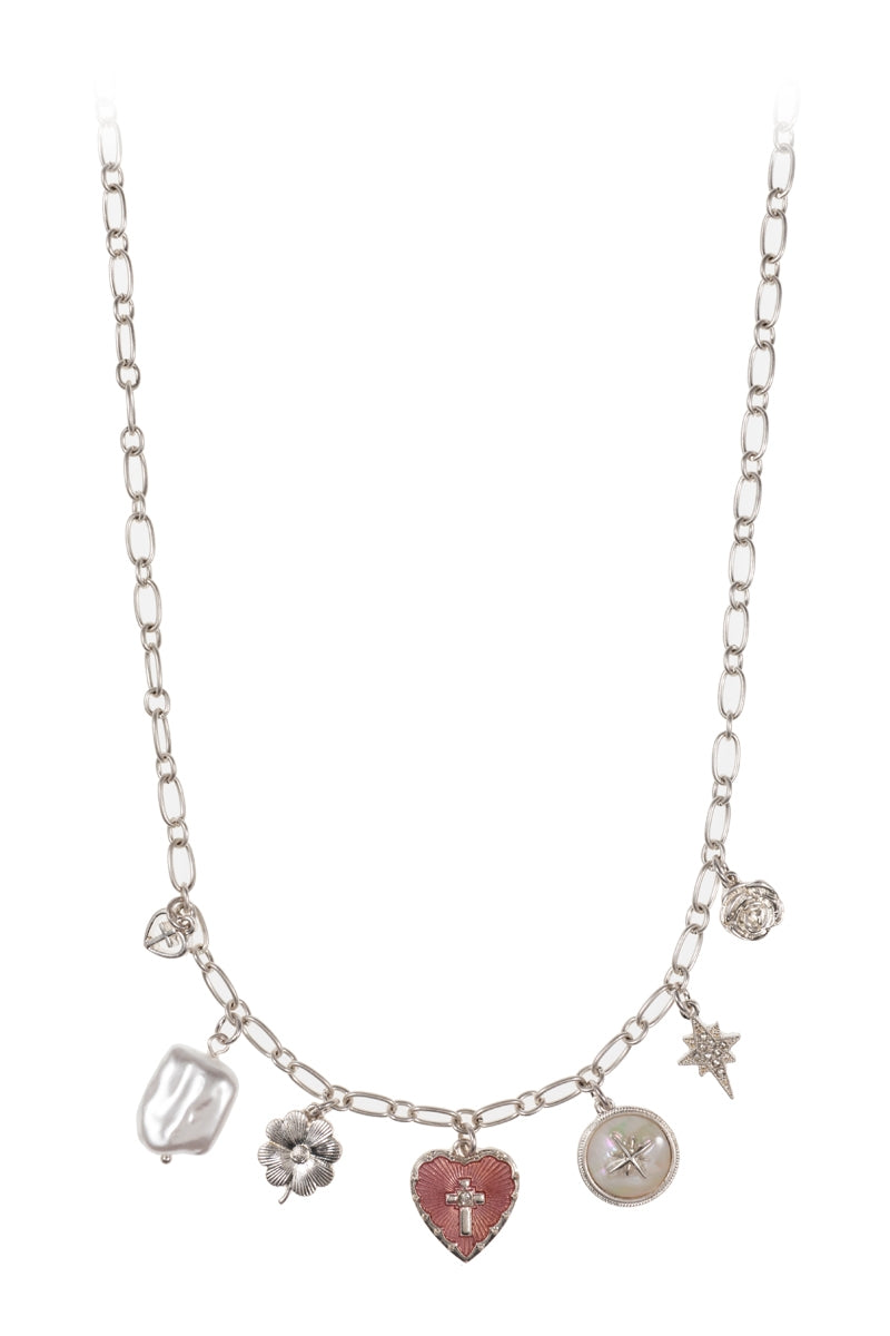 This necklace features a beautiful mix of 16-inch charms including a heart, cross, clover, pearl, and star shapes. Made of high-quality metal, it's a perfect accessory to elevate any outfit. Versatile and unique, it's a must-have for any fashion enthusiast looking to add a touch of elegance to their wardrobe.
