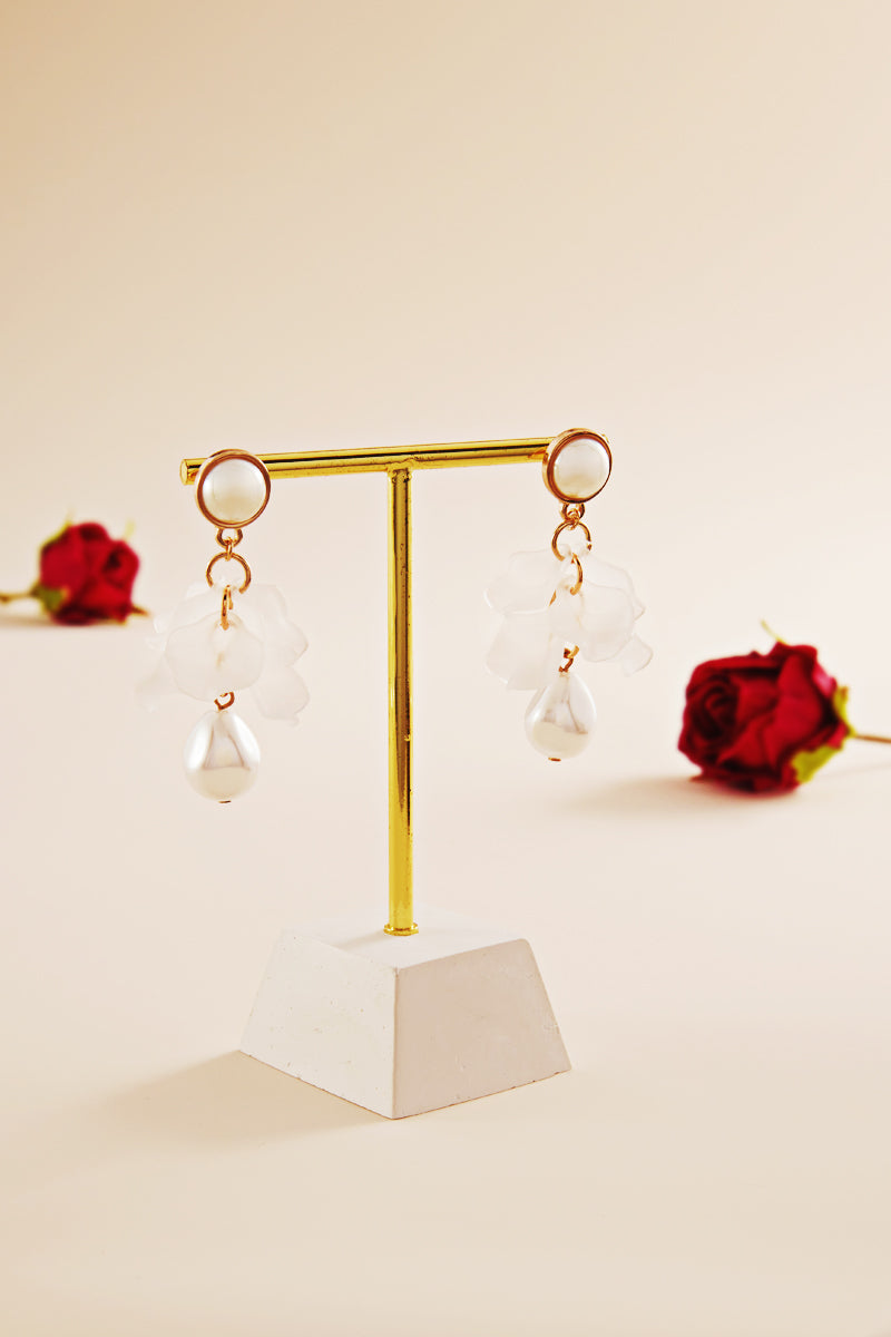 Linear Shaped Pearl Flower Post Earrings