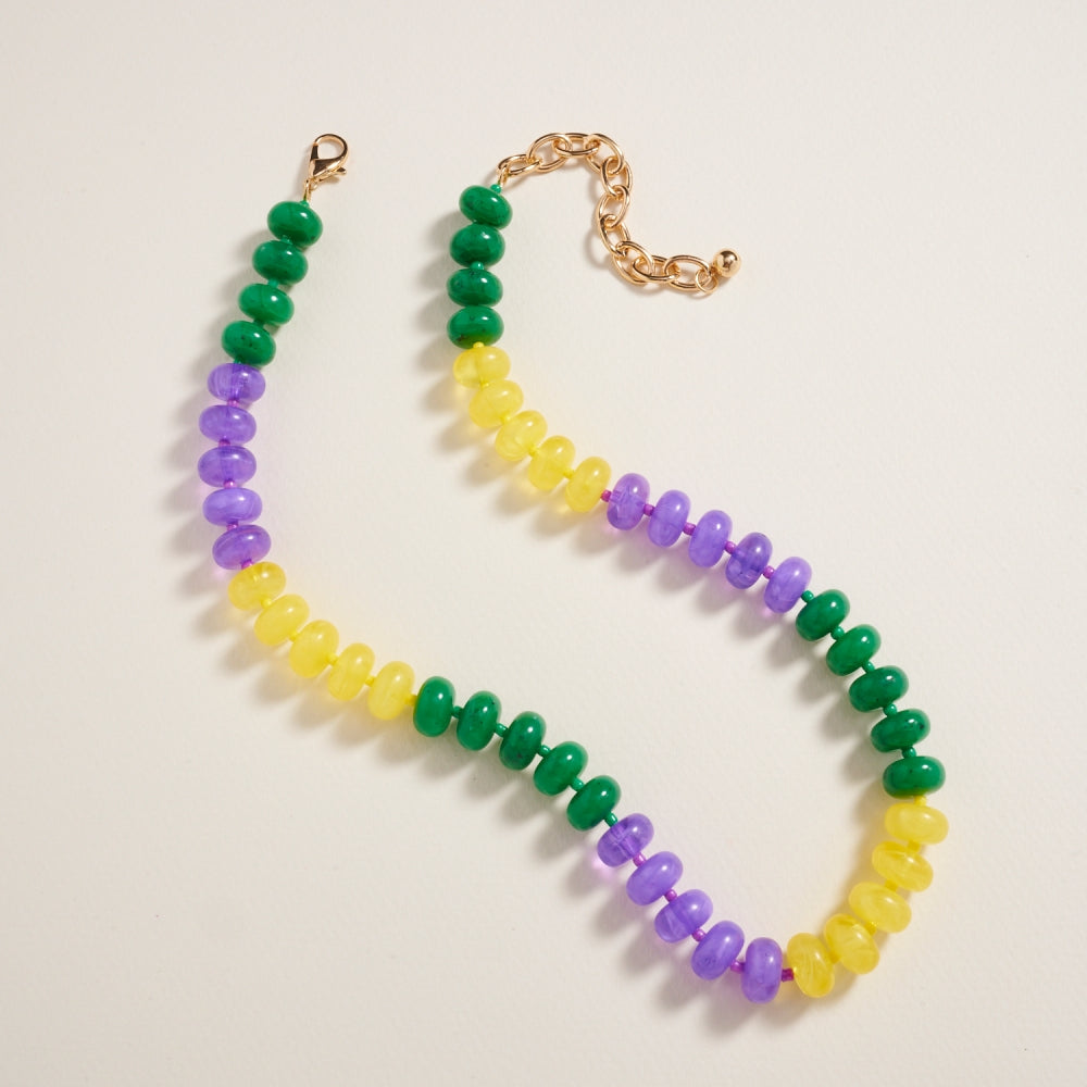 Show your Mardi Gras spirit with this ombre marbled beaded necklace in bold carnival colors. The secure clasp makes it easy to wear all day during festivities.