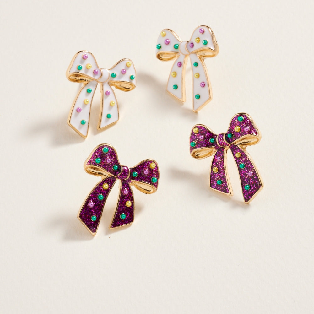 A sweet mix of tradition and flair, these pearl ribbon bow post earrings are made for Mardi Gras magic. Featuring shimmering accents and a soft bow silhouette, they’re lightweight, comfortable, and eye-catching for the season.
