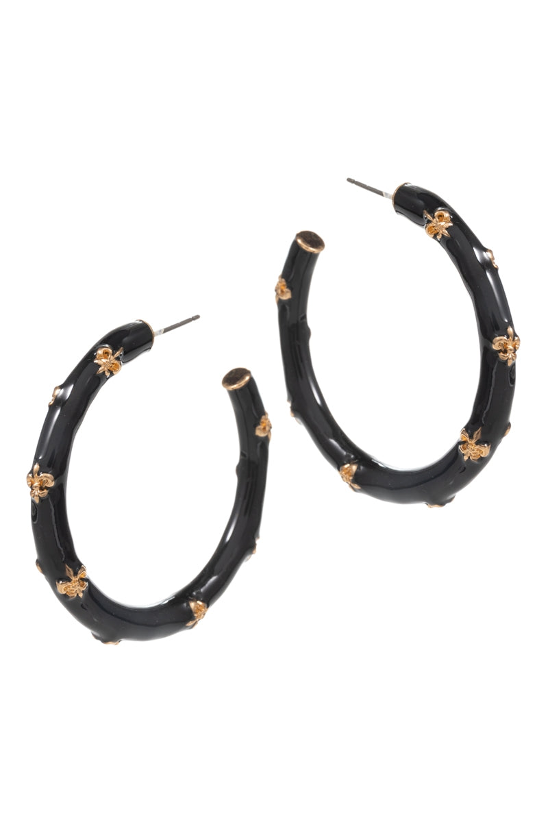 Expertly crafted 1.75 inch round hoop earrings featuring a delicate fleur de lis pattern on enamel. Elevate your style with these unique and elegant earrings that add a touch of sophistication to any outfit. Perfect for any occasion, these earrings are a must-have for any modern woman's wardrobe.