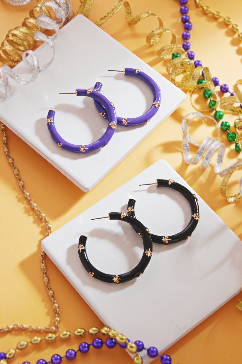 Mardi Gras Round Fleur De Lis Enamel Hoop Earrings