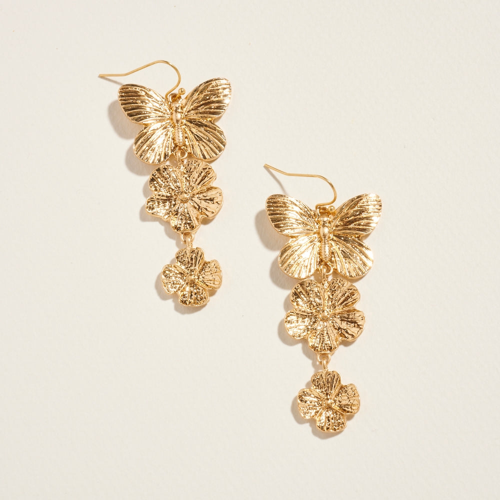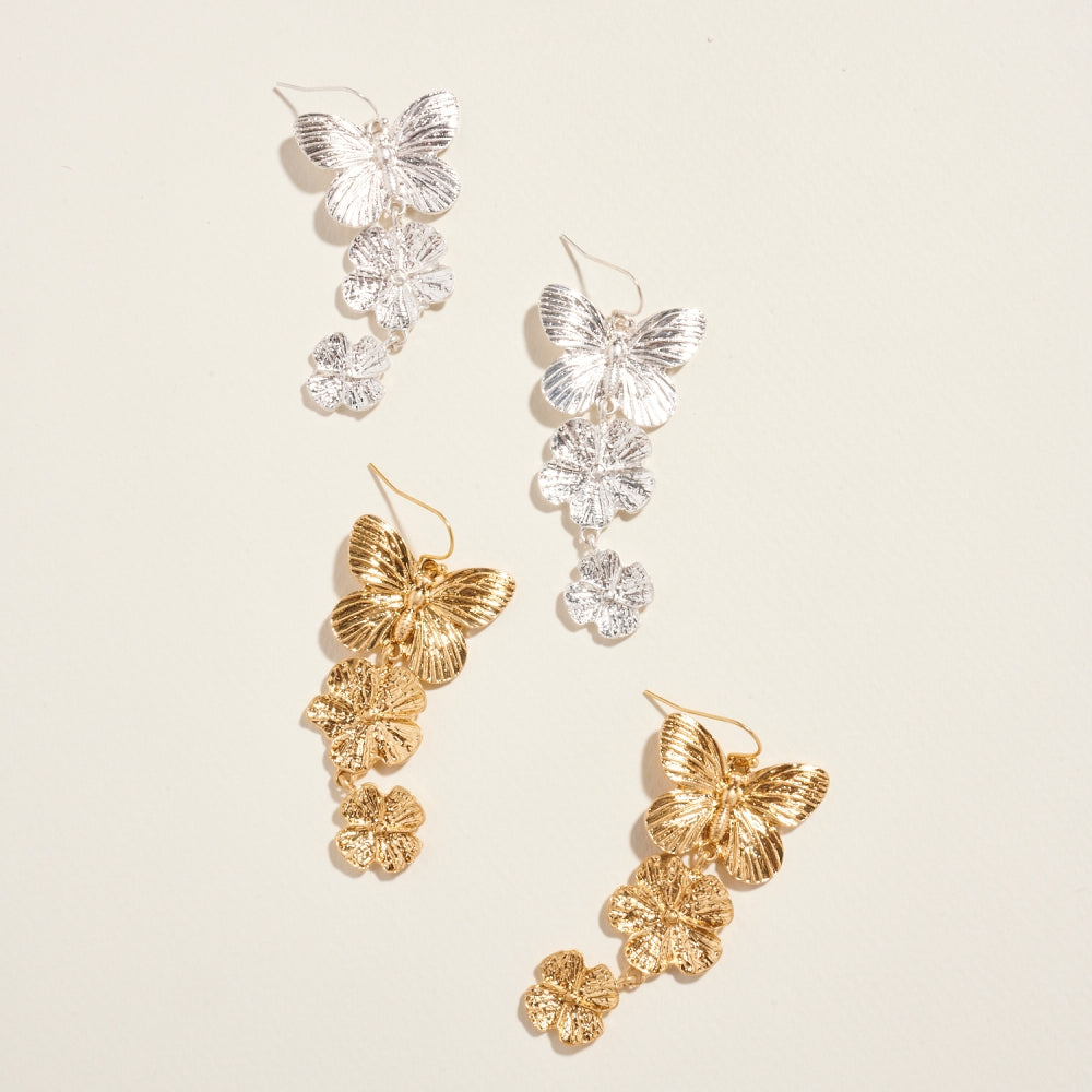 These earrings feature delicate butterfly and floral links that cascade beautifully in a drop design. Lightweight and feminine, they bring a touch of nature-inspired elegance to any look.
