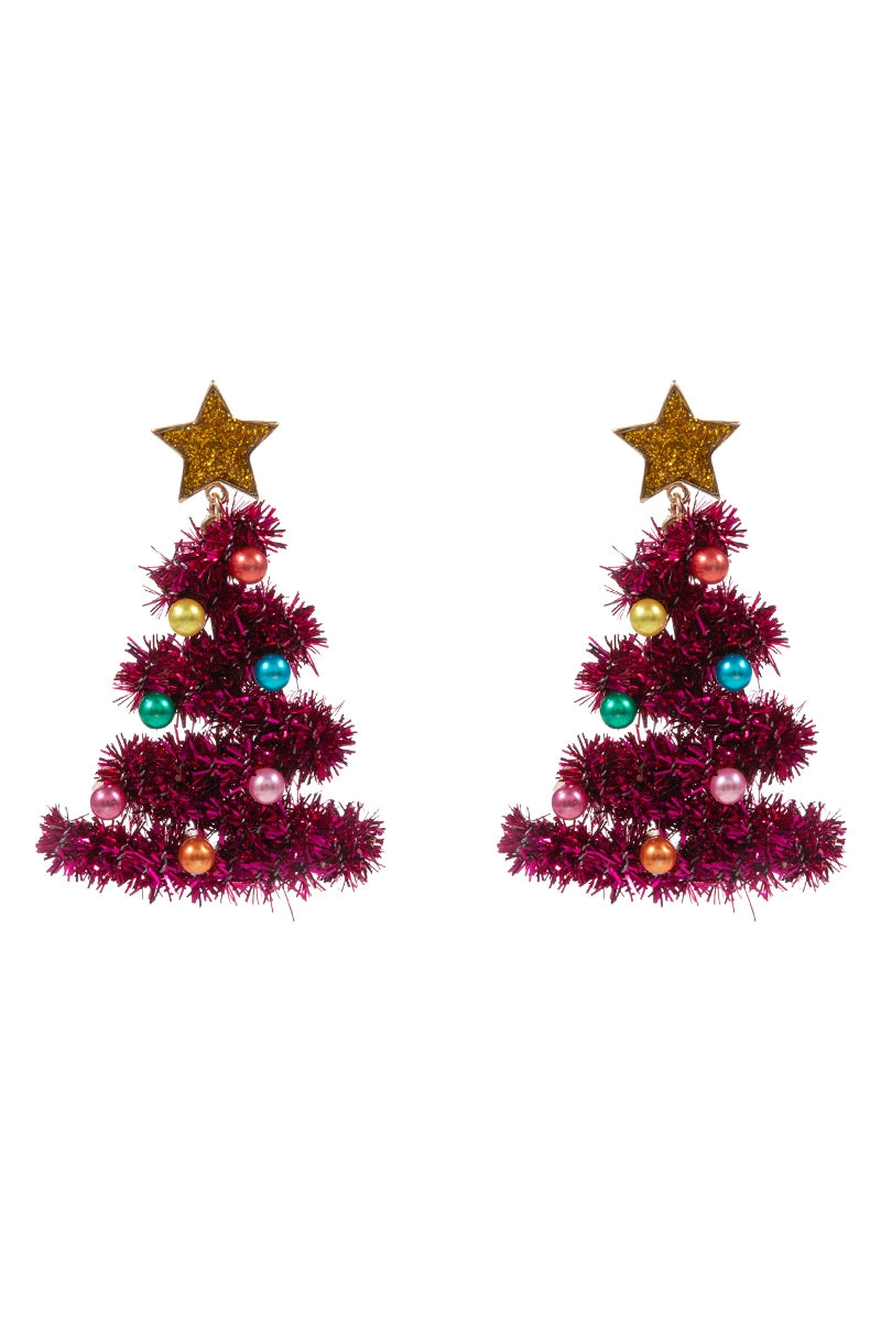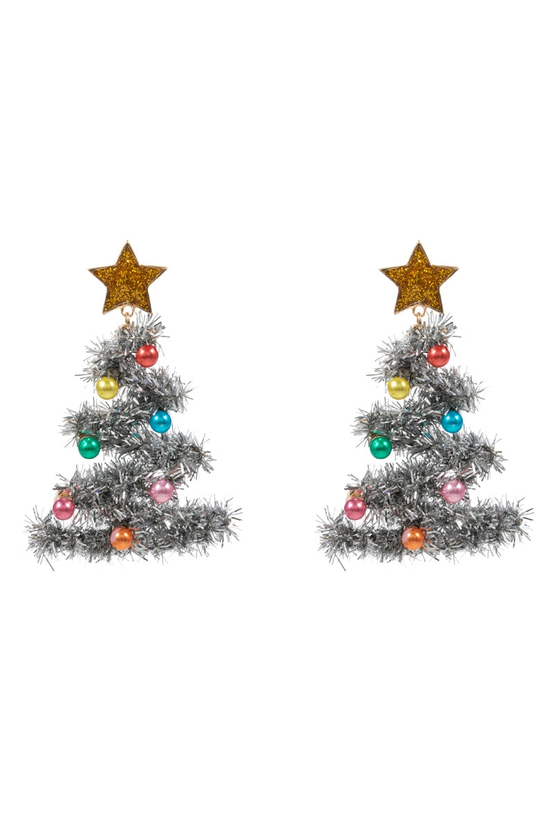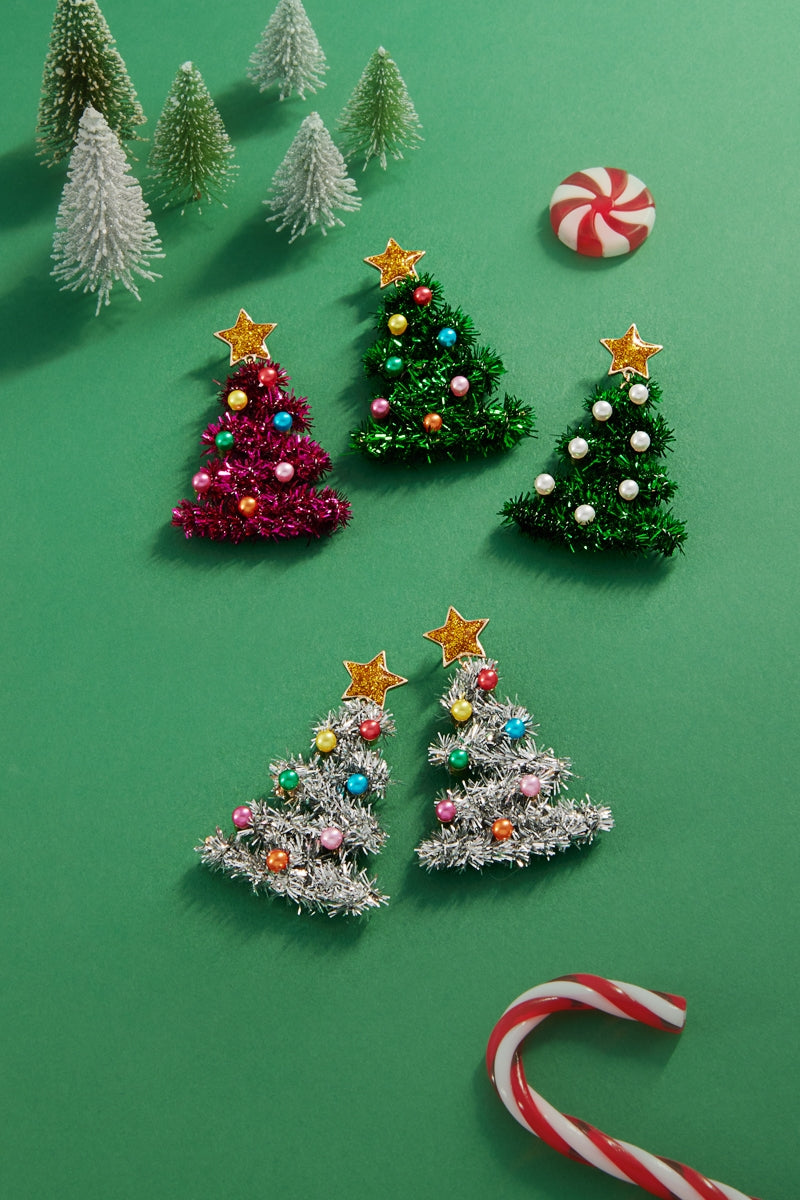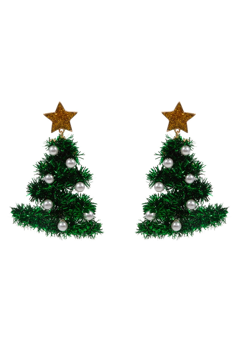 Celebrate the season in style with long Christmas tree earrings featuring elegant metallic threads and pearls.