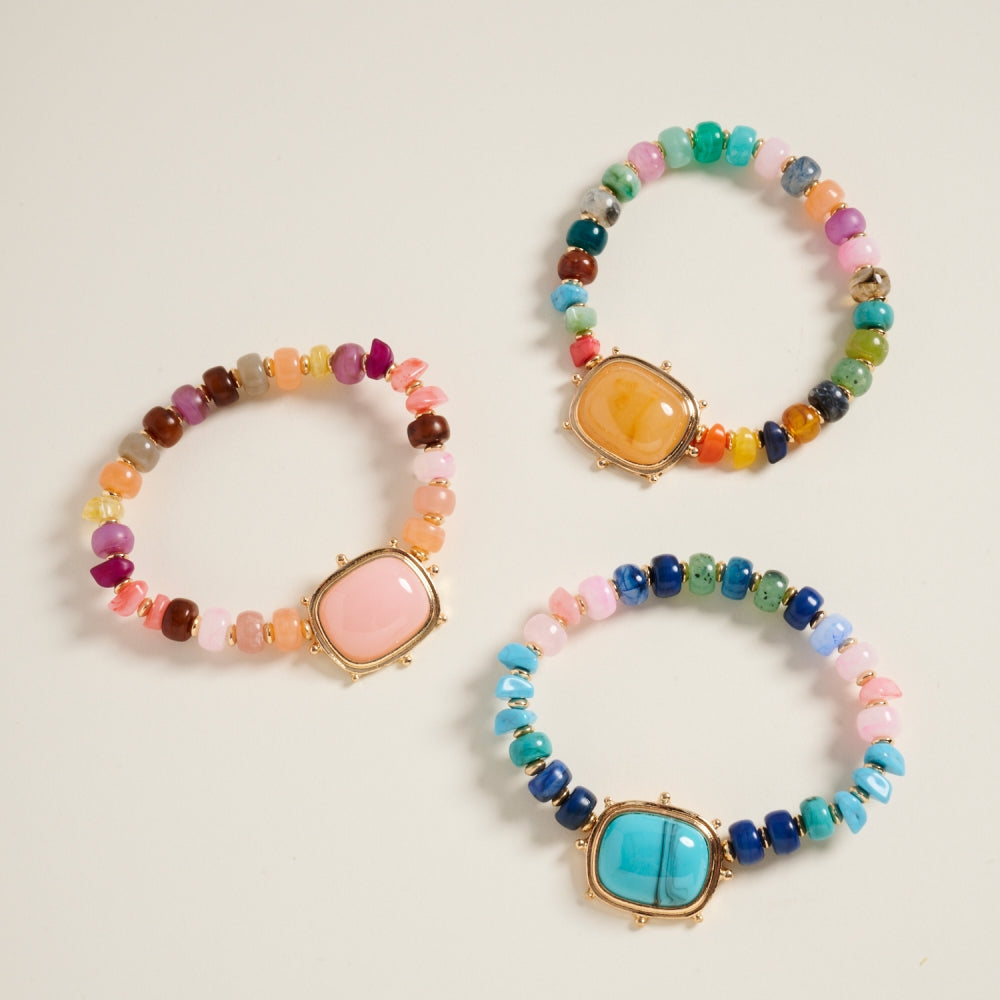 A blend of marbled and ombre tones meets modern charm in this beaded stretch bracelet. Finished with a pendant accent, its an everyday statement piece.