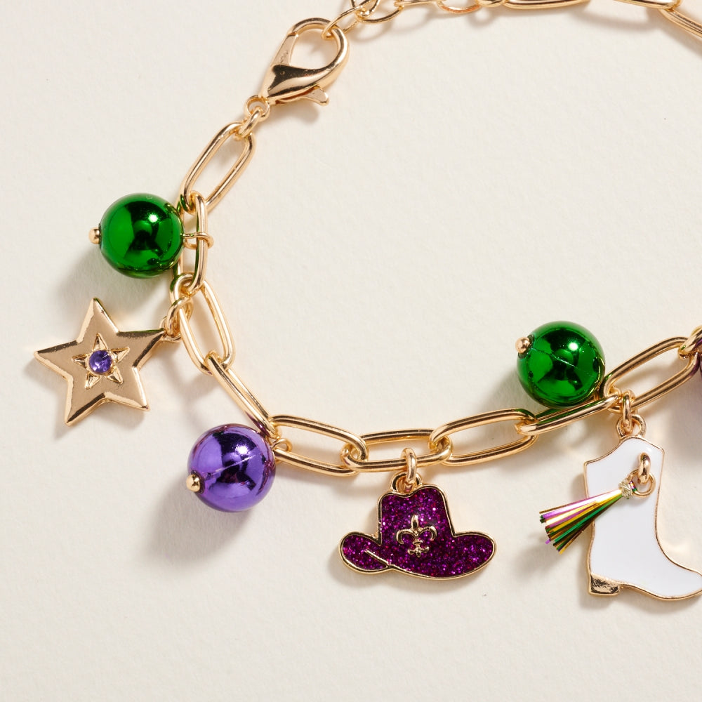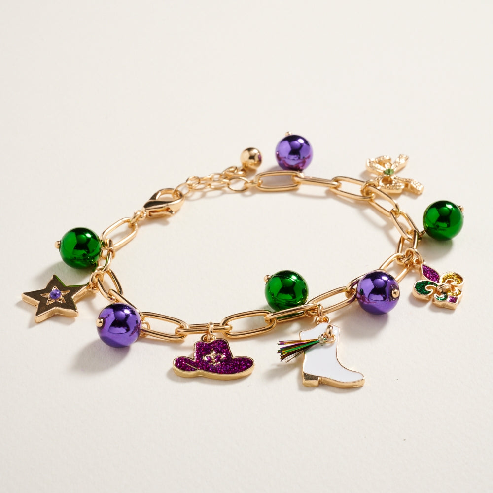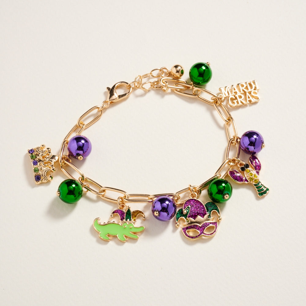 Celebrate in full color with this charm-packed Mardi Gras bracelet. Featuring a mix of festive beads and fun charms on a classic chain with clasp closure, it’s the perfect piece to complete your carnival look.