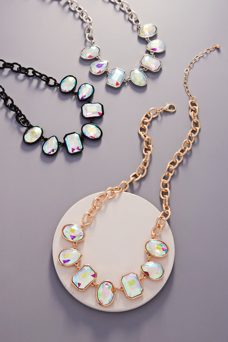 Expertly crafted with a mix of rhinestones, this 18 inch statement necklace adds a touch of glamour to any outfit. The combination of different shapes adds visual interest and elevates your style.