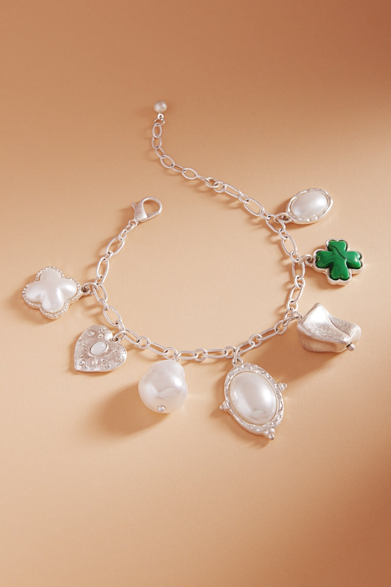 Multi Metal Pearl Charm Cluster Clasp Bracelet