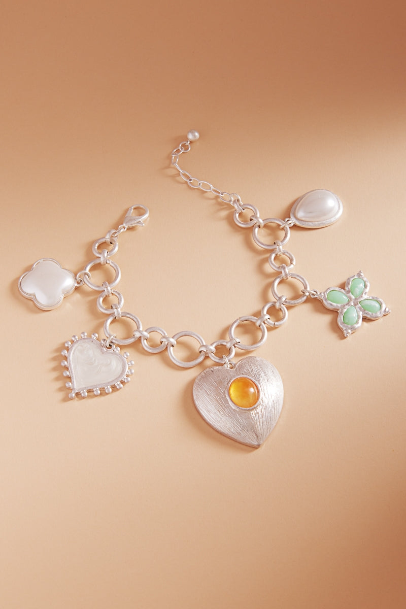 Multi Metal Pearl Charm Cluster Clasp Bracelet
