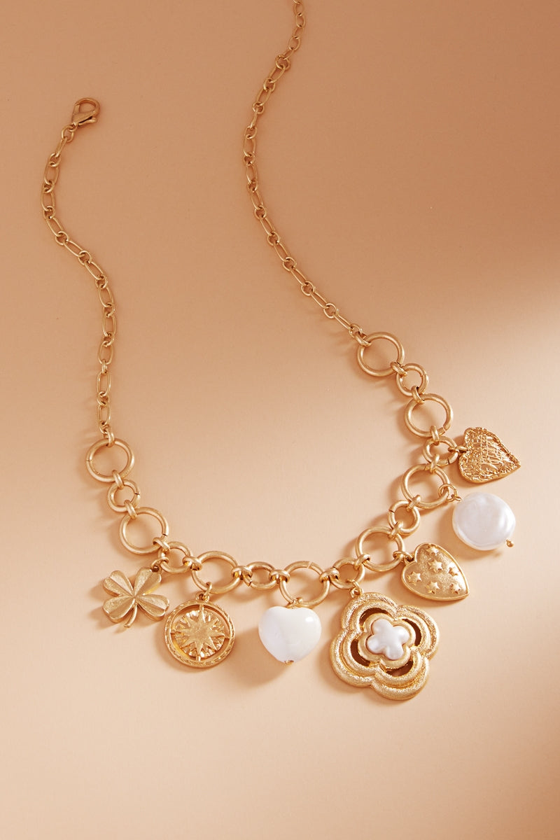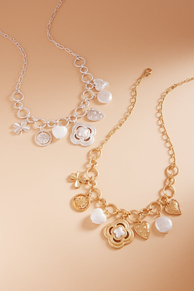 This versatile 17-inch necklace features a collection of beautifully crafted metal charms in various shapes, accented by a lustrous pearl cluster. Elevate your outfit with this short necklace that adds a touch of elegance and sophistication. Perfect for any occasion, this necklace is a must-have for any jewelry lover.