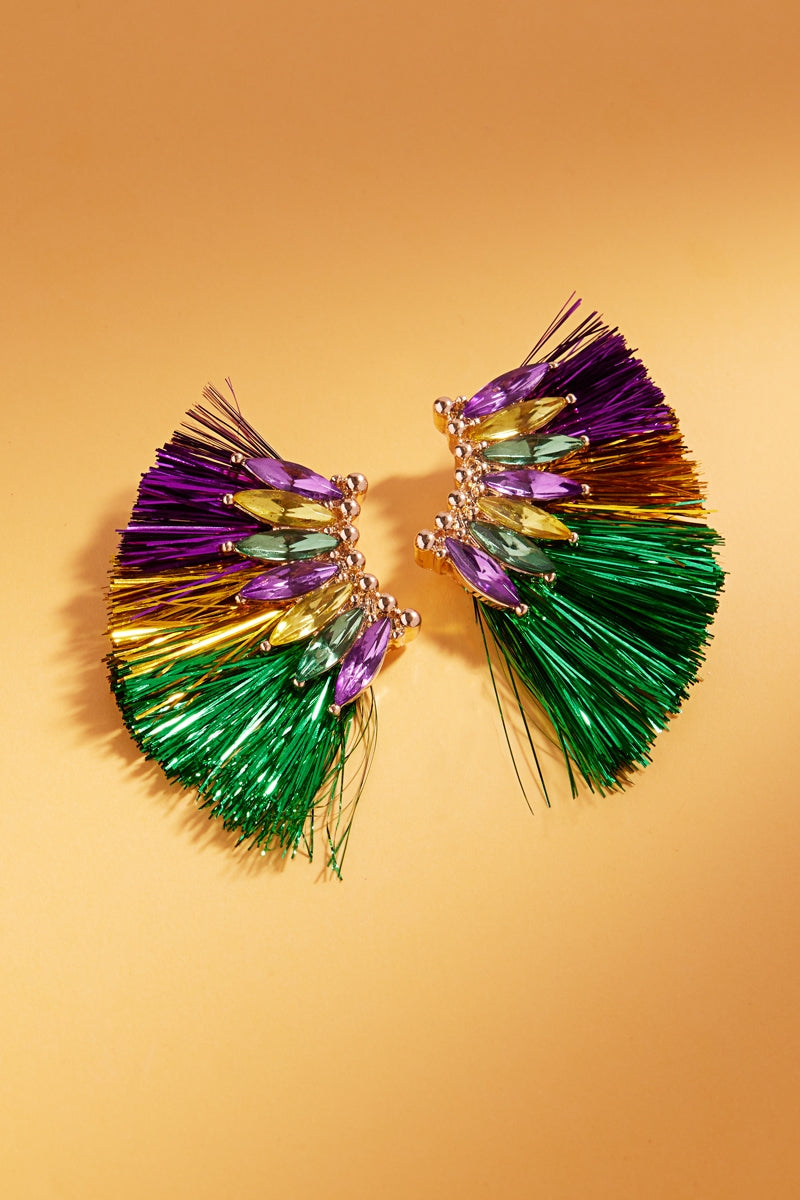 These 2.25 inch hypoallergenic titanium post earrings feature an organic shape with vibrant Mardi Gras colors, metallic threading, and sparkling stones. Expertly crafted, they provide a bold and stylish statement while being gentle on sensitive skin.