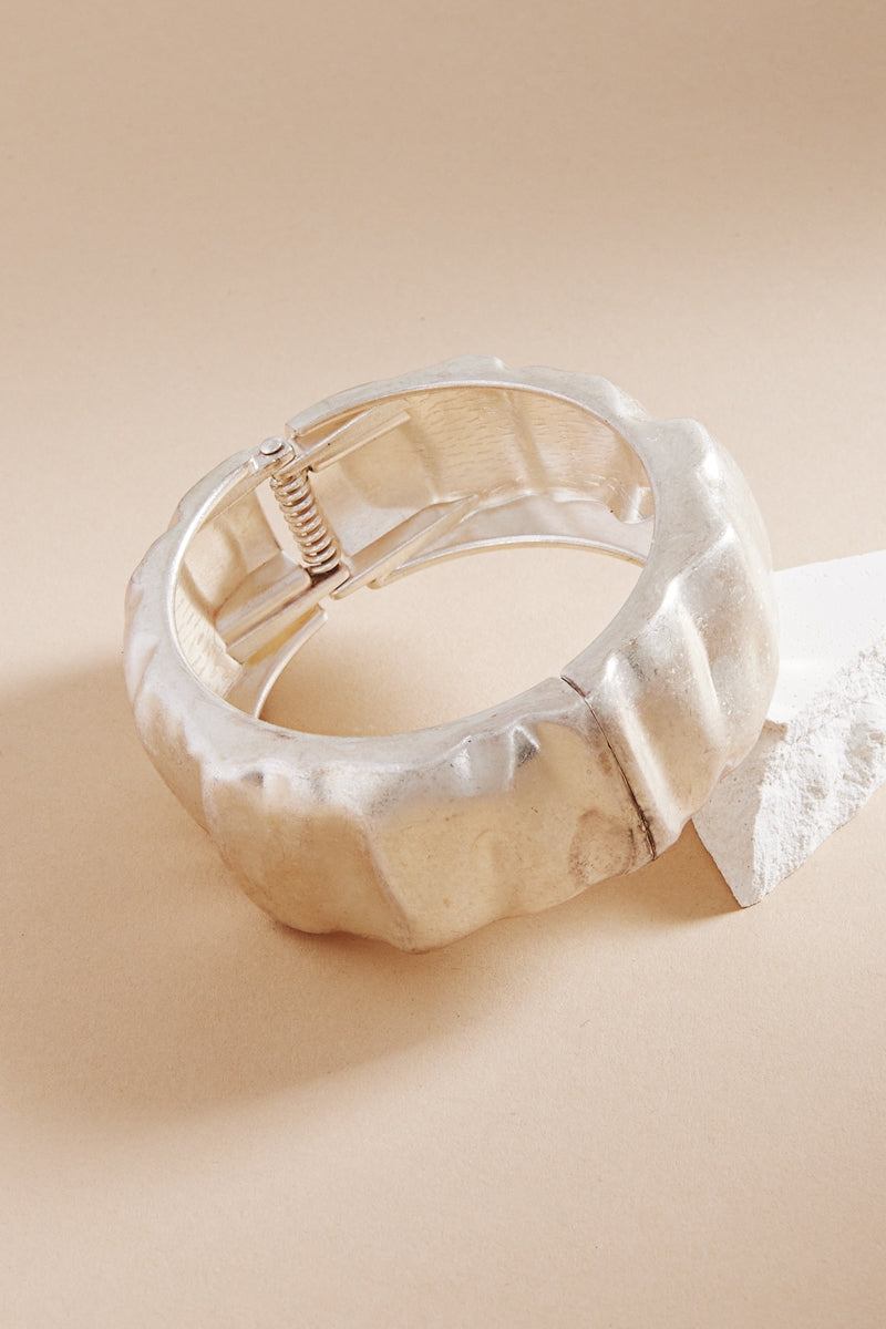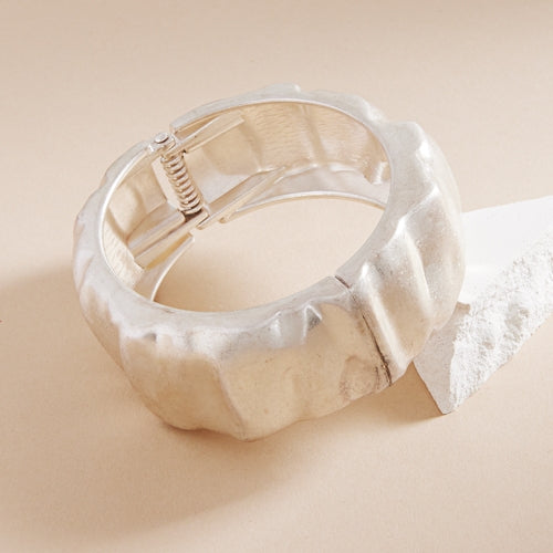 Discover a unique, modern twist on the classic bangle bracelet with our 7.25 inch organic textured metal hinge design. Made with certified organic materials, this bracelet not only adds a touch of elegance to any outfit, but also promotes environmental sustainability. Upgrade your jewelry collection today!