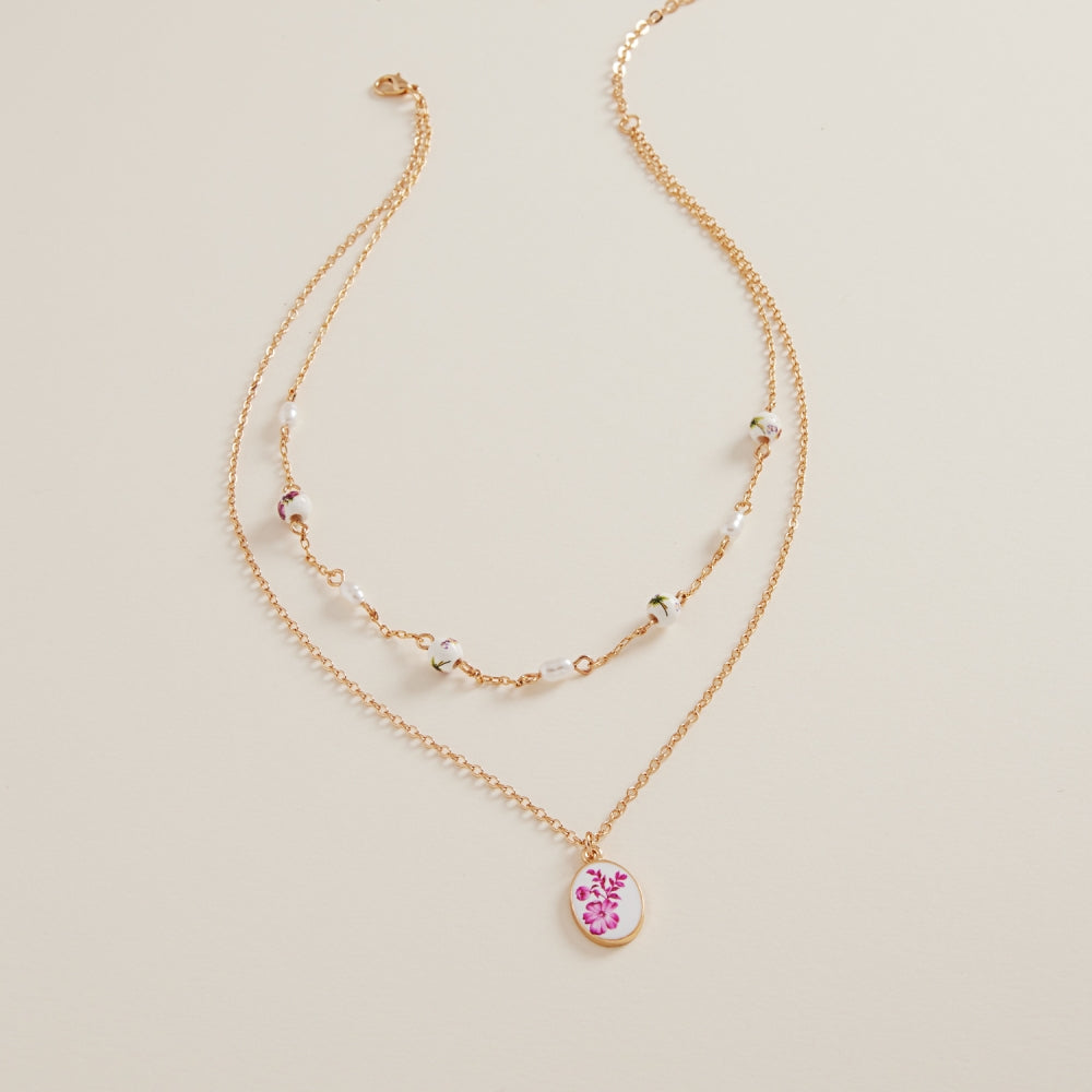 This 14-16 inch layered necklace features oval-shaped enameled charms with a patterned print, beautifully combined with smooth ceramic beads. The double-layered design adds depth and movement, while the playful mix of textures brings a vibrant, handcrafted feel. Adjustable in length for a perfect fit at the neckline.