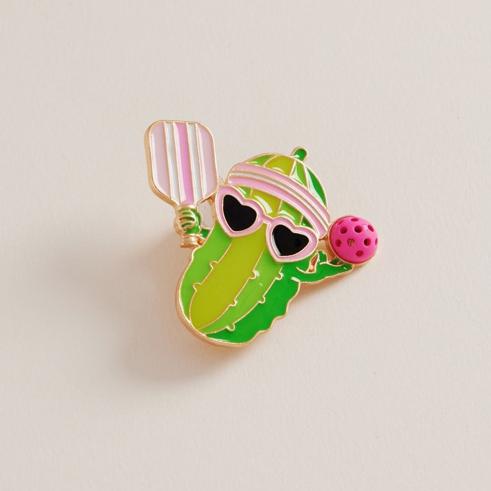 Bring some fun to your outfit with this playful pickleball brooch featuring a pickle character with a paddle and ball. A great gift for fans of the game who love a little humor.