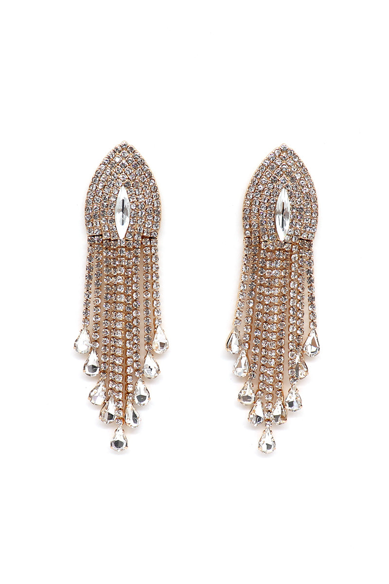 These 3-inch rhinestone brass linear earrings feature hypoallergenic titanium posts for comfortable wear.