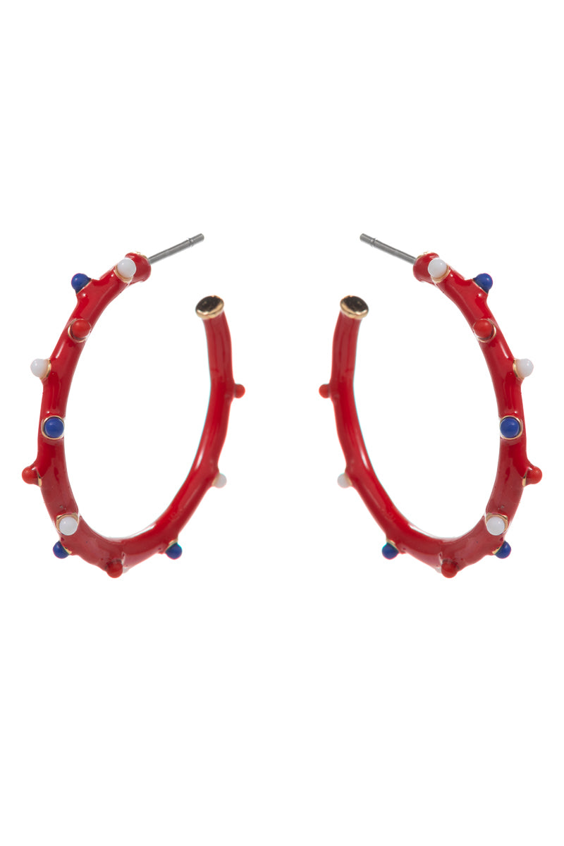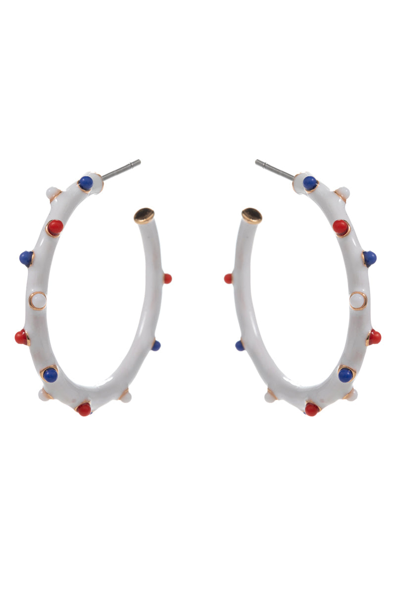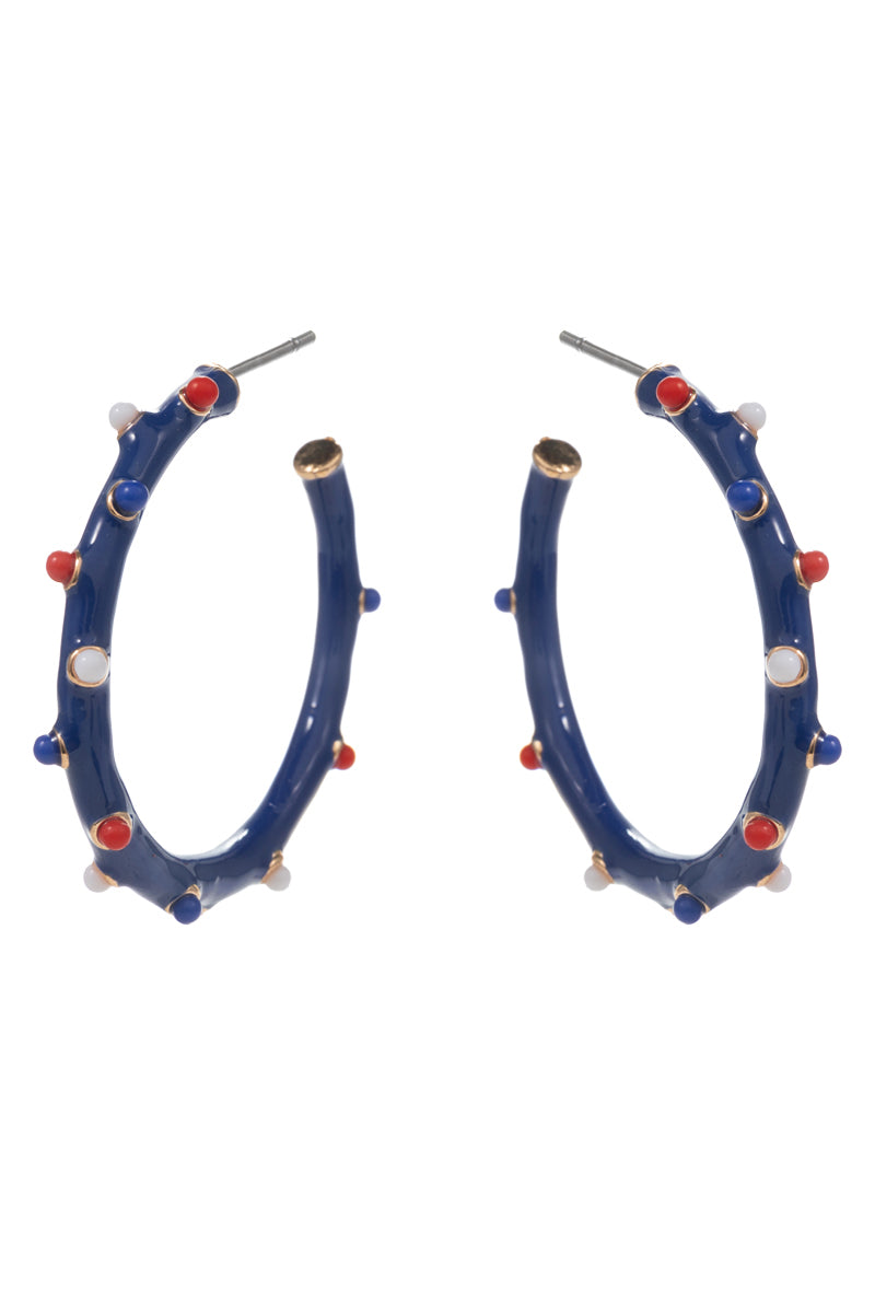 This 1.75 inch round-shaped hoop earring features a vibrant American flag color enamel with decorative beads. Add a touch of patriotic style to your look with this expertly crafted earring.