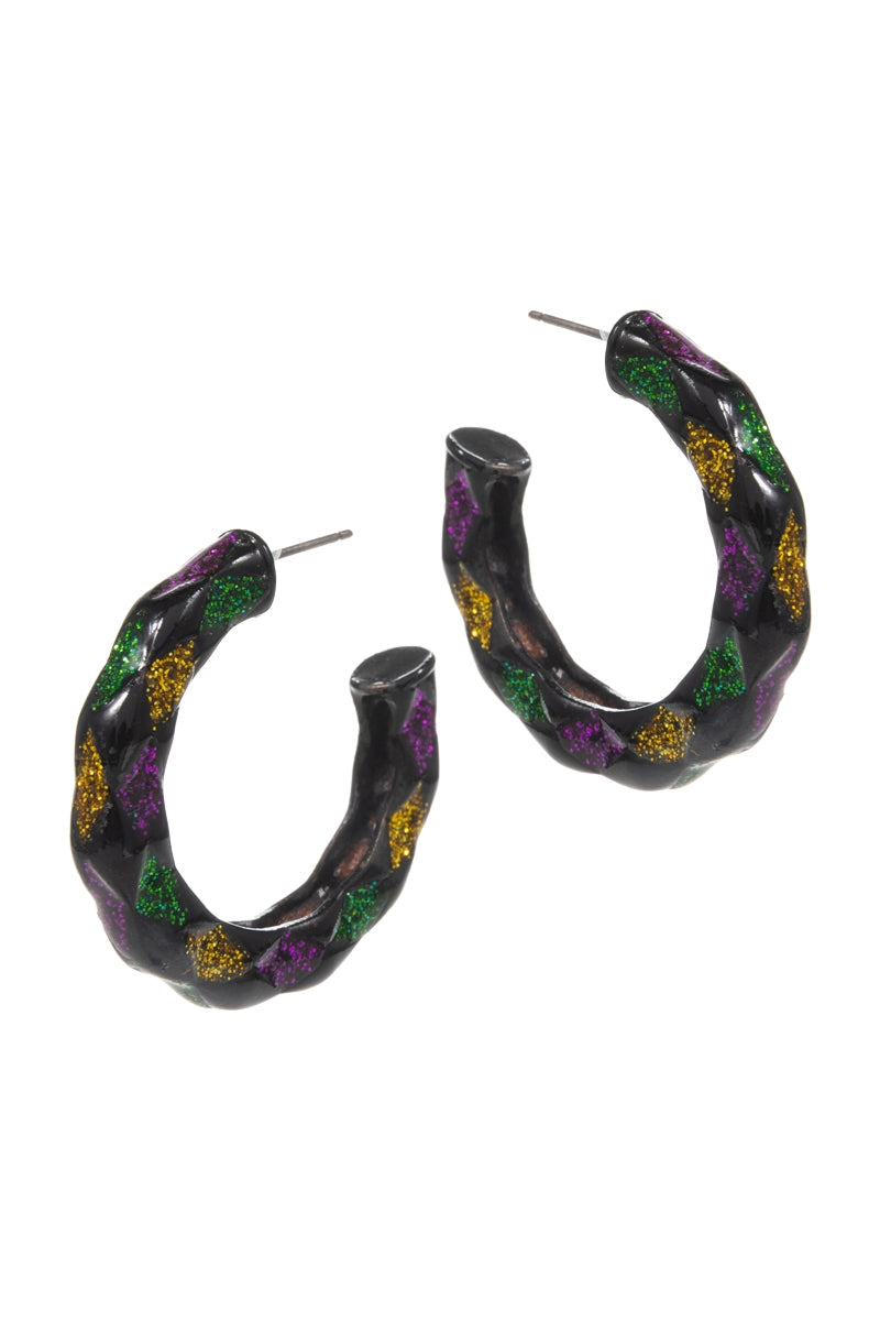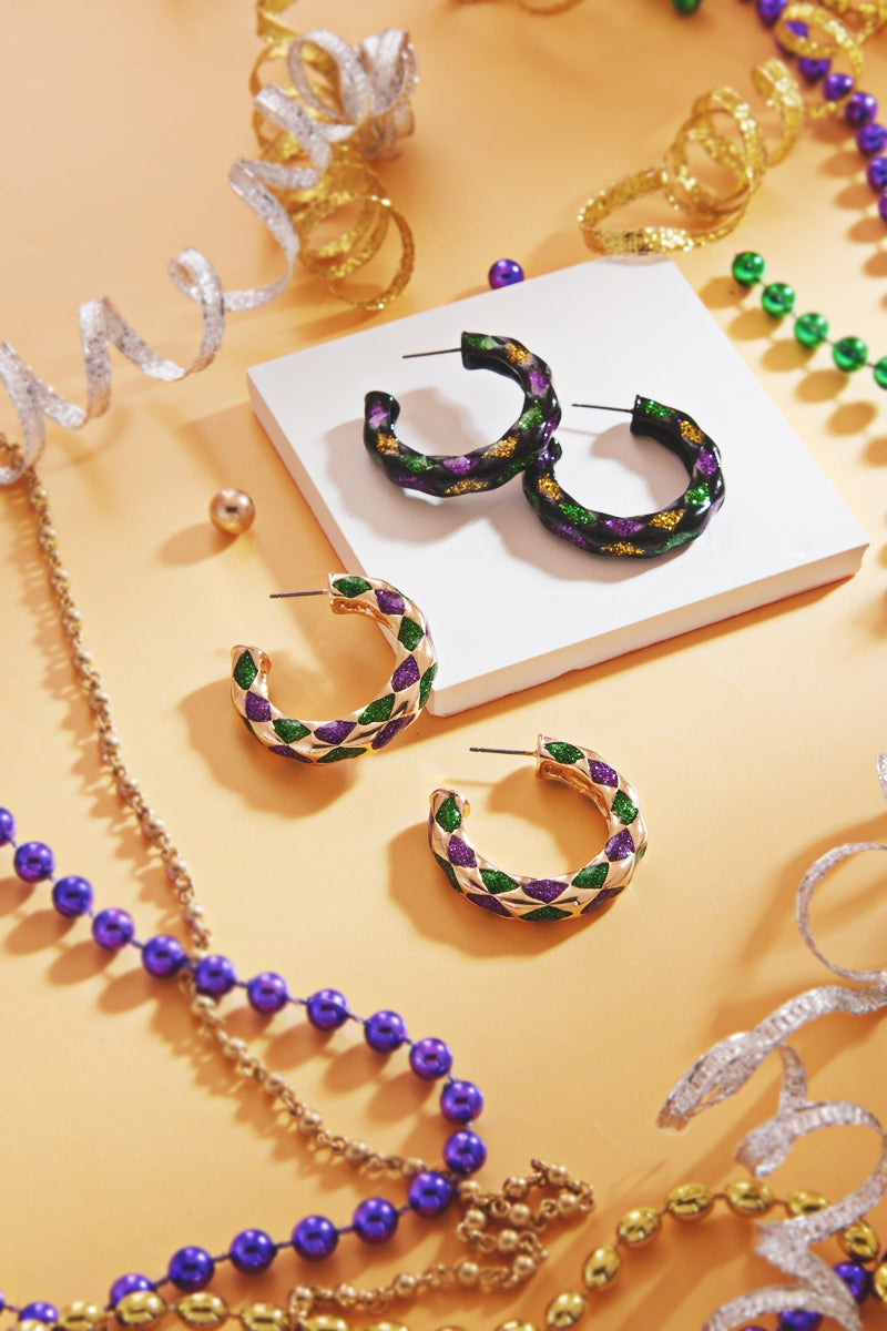 Round Check Pattern Mardi Gras Color Hoop Earrings