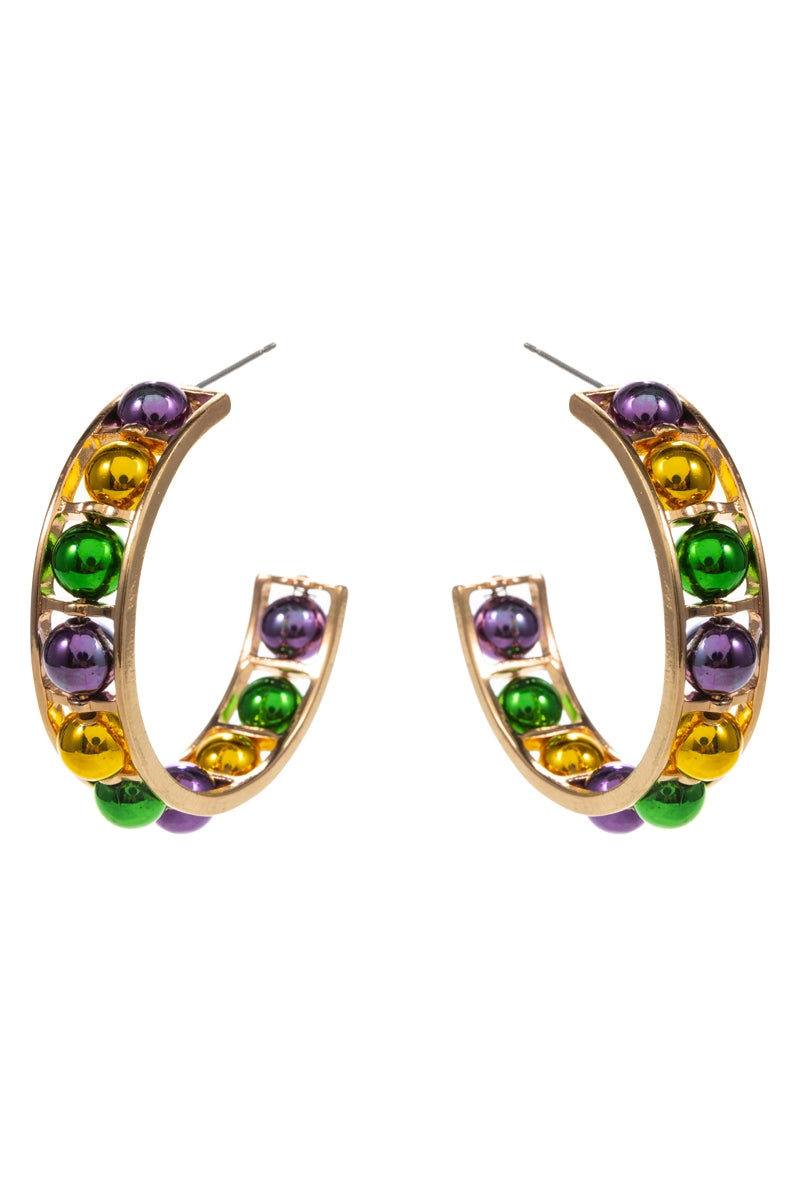 Round Mardi Gras Color Metal Beads Hoop Earrings