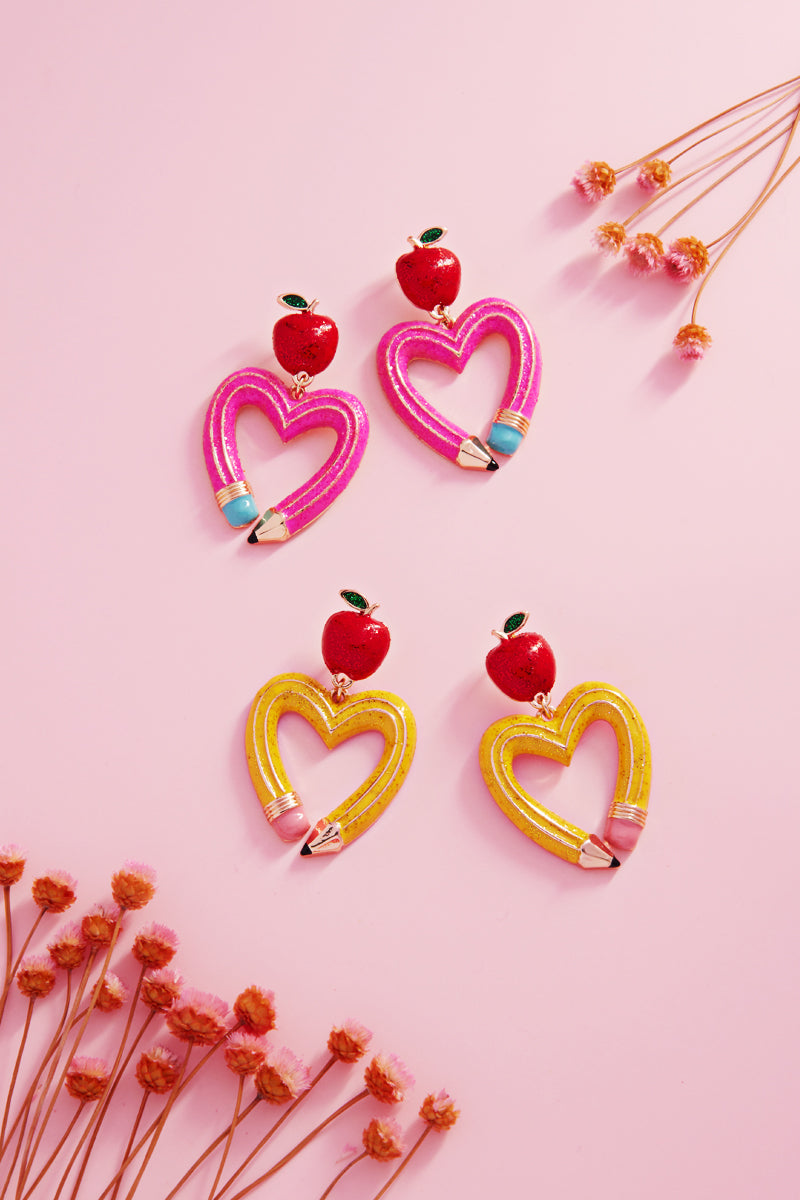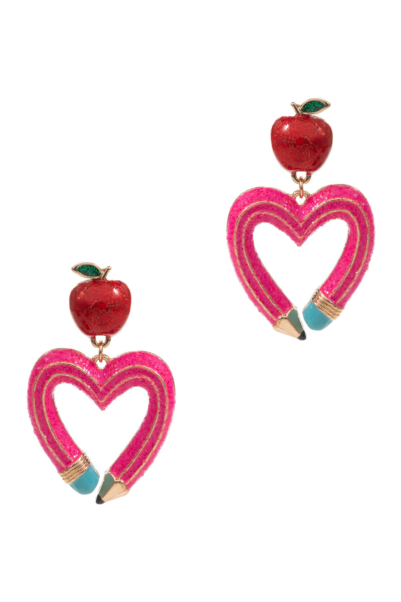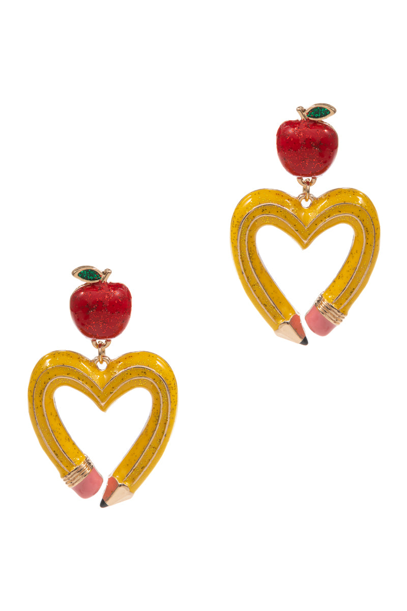 School Heart Pencil Wth Apple Enamel Post Earrings