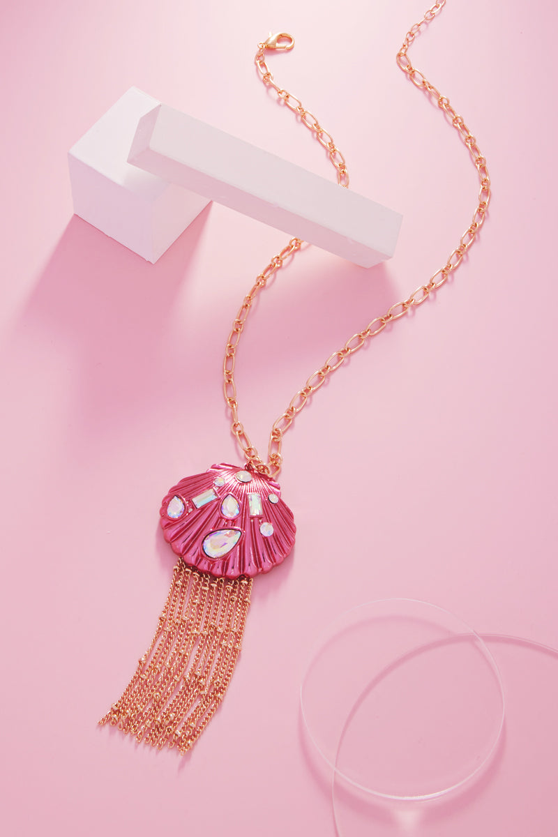 Made for those who appreciate unique and sophisticated accessories, our necklace features a stunning shell-shaped design adorned with sparkling rhinestones and finished with a delicate tassel.