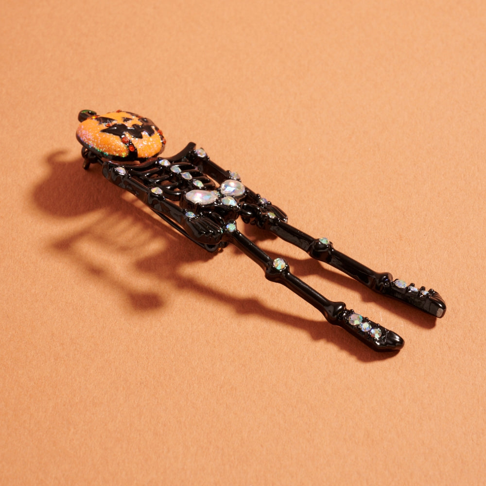 Add spooky charm to your outfit with this skeleton brooch featuring a pumpkin head and sparkling rhinestones. Perfect for Halloween and fall styling.