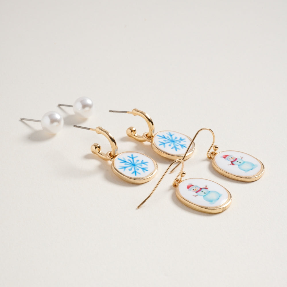 A charming winter trio, this 3-piece earring set features a cheerful snowman, a delicate snowflake, and a pearl-accented enamel stud. Perfect for festive flair all season long.