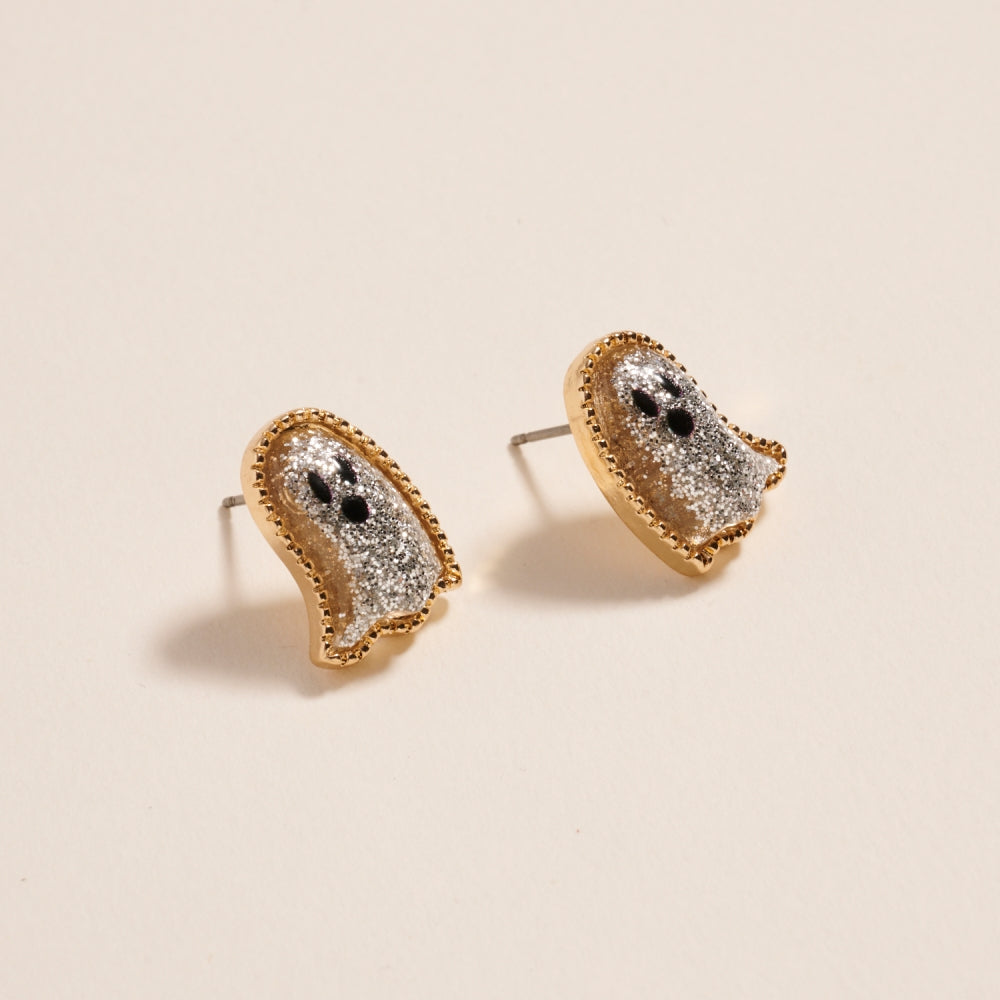 Add sparkle to your spooky season with these ghost-shaped stud earrings. Filled with glitter and designed for Halloween, they bring playful charm to any fall outfit.