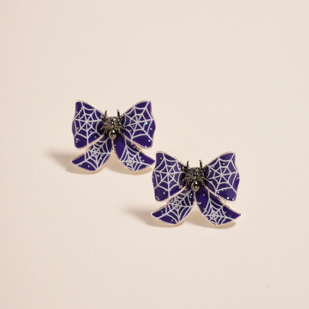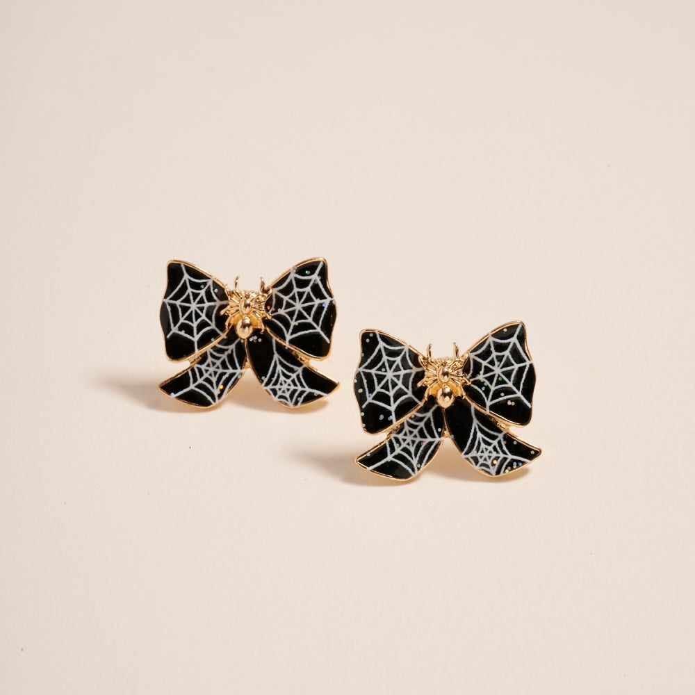 Add a spooky-chic touch to your accessories with these spider post earrings. Designed with webbing and a bow, they offer a fun twist on Halloween style.