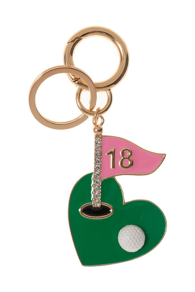 This sleek keychain features a 3.5 inch golf hole shaped enamel design, adorned with sparkling stones and a colorful golf ball charm. Show off your love for the game of golf while keeping your keys organized and easily accessible. Perfect for any avid golfer or as a gift for a golf enthusiast.