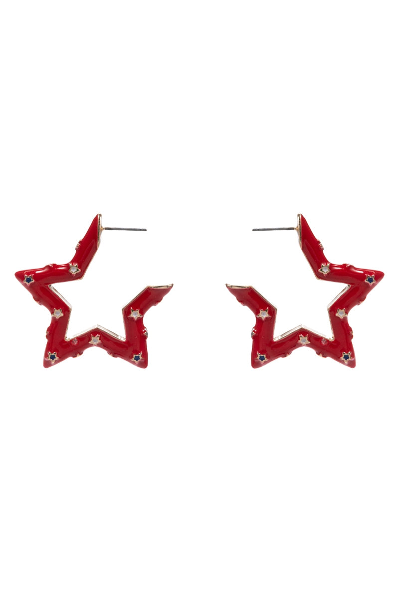 These hypoallergenic titanium hoop earrings feature a 1.5 inch star-shaped enamel design in the colors of the American flag. With titanium posts, they are safe for sensitive ears. Add a patriotic touch to your outfit with these lightweight and stylish earrings.