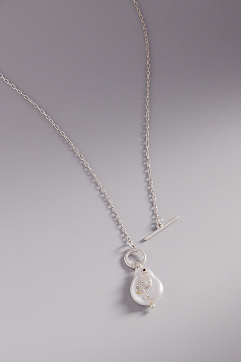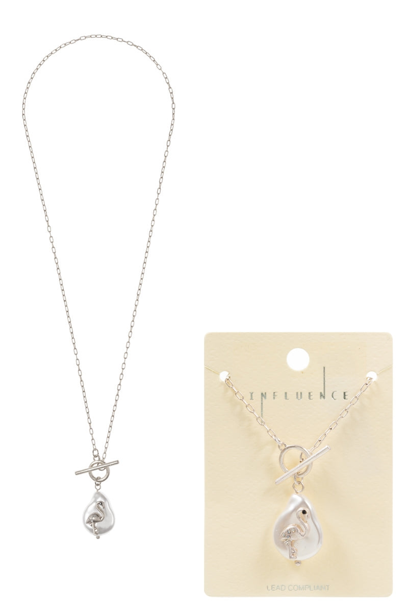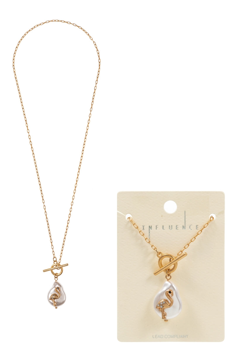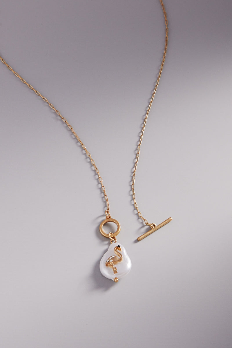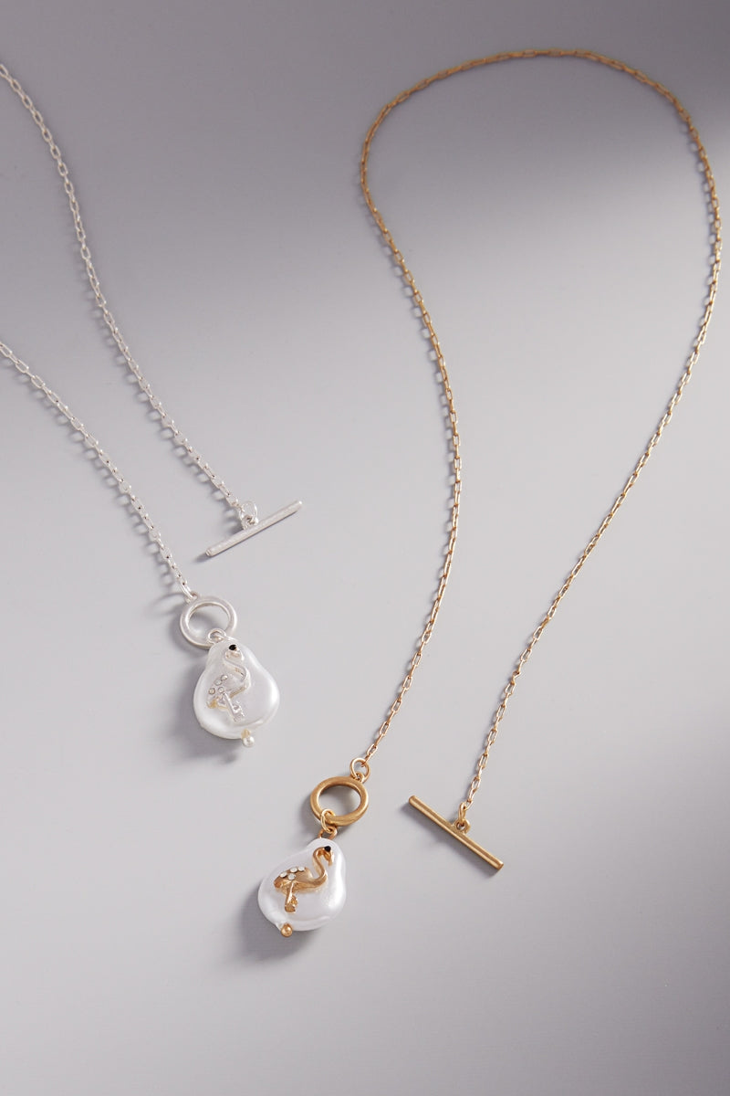 This organic shaped pearl necklace features a unique 17 inch design and a playful flamingo charm. Made with high-quality, organic materials, it adds a touch of elegance and whimsy to any outfit. Perfect for any occasion, this necklace is a must-have for any fashion-forward individual.