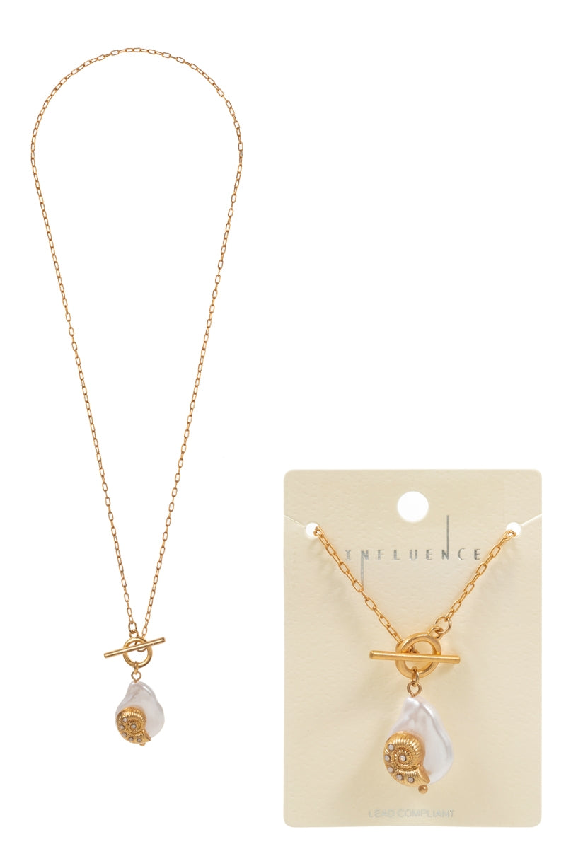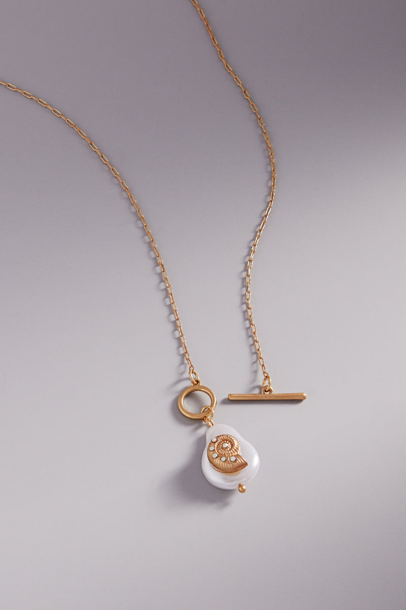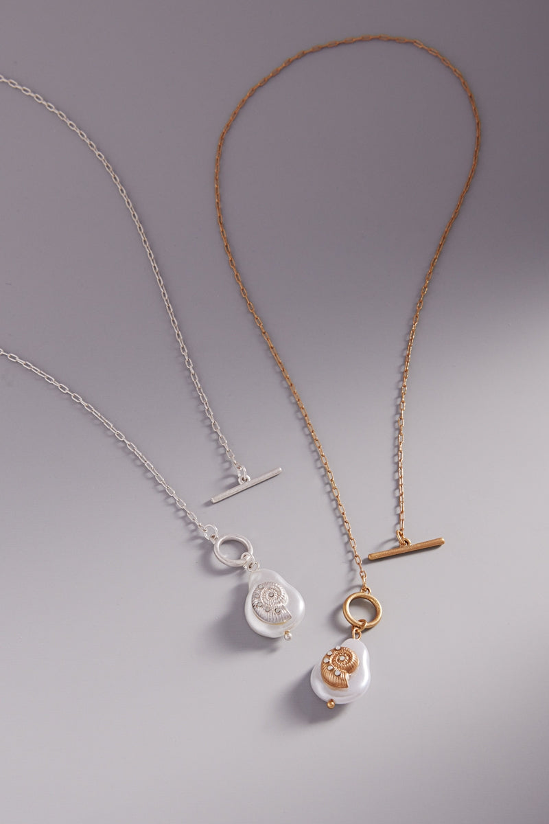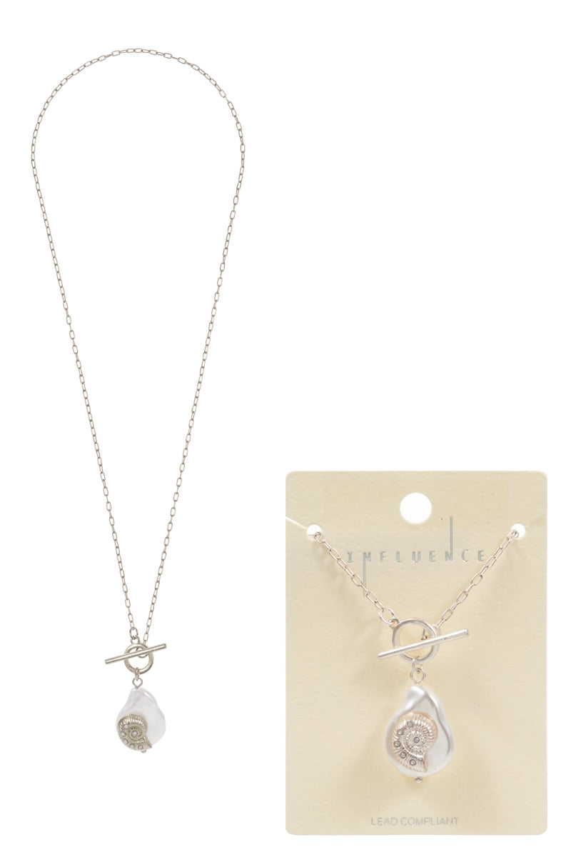 Enhance your outfit with our 17 inch organic shaped pearl and shell necklace. Made from natural, sustainable materials, this necklace will not only elevate your style but also make a positive impact on the environment. Perfect for any occasion, add a touch of elegance to your wardrobe with this unique piece.