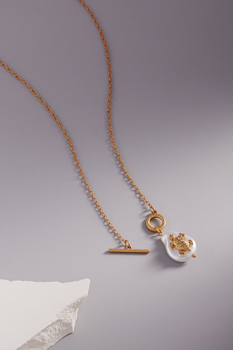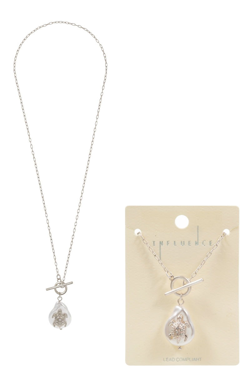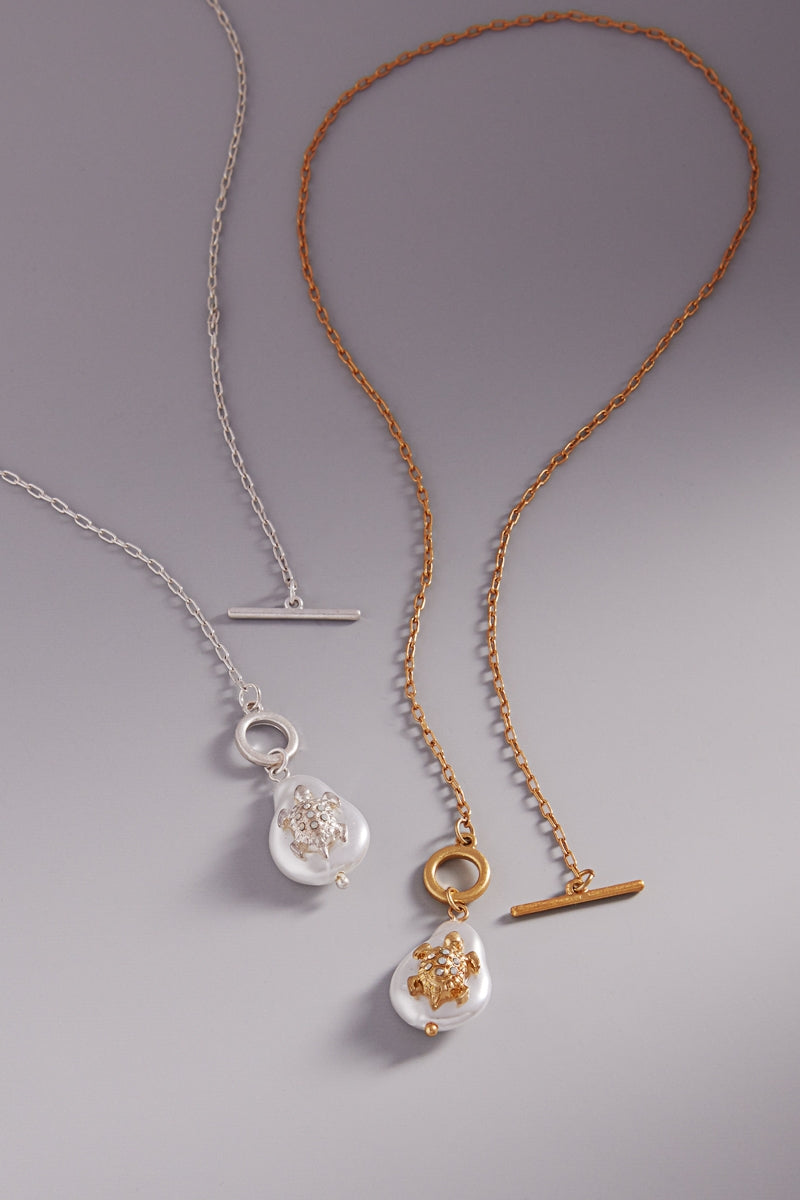 This 17-inch necklace features an organic-shaped pearl with a charming turtle design. Made with organic materials, this necklace exudes both elegance and sustainability. Enhance your look with this unique piece that adds both style and substance to any outfit.