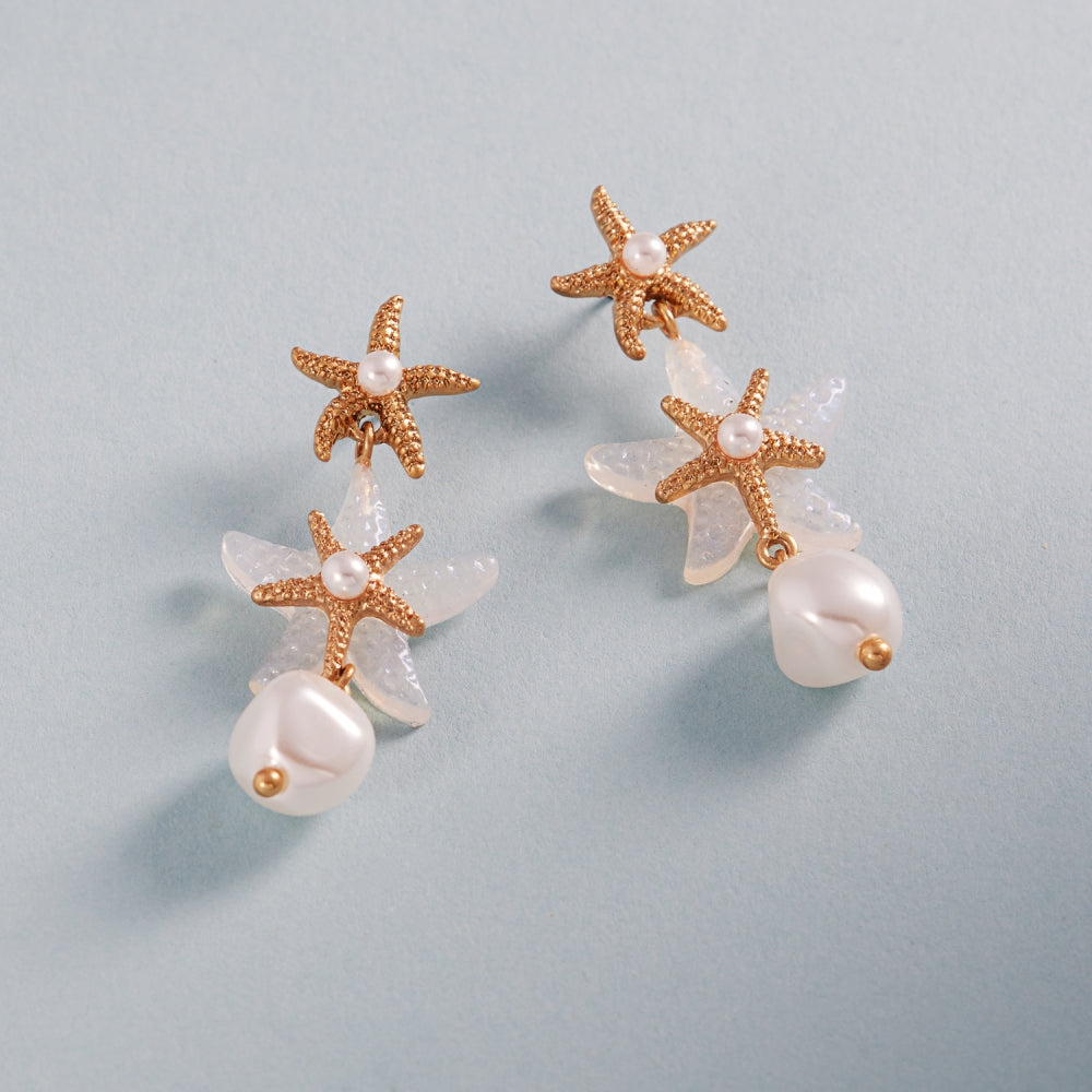 Make a coastal statement with these Starfish Shaped Epoxy Stone Earrings, accented with a delicate pearl detail. Crafted with hypoallergenic titanium posts for comfort, they blend ocean-inspired elegance with a touch of shimmer perfect for seaside vibes or dressed-up summer looks.