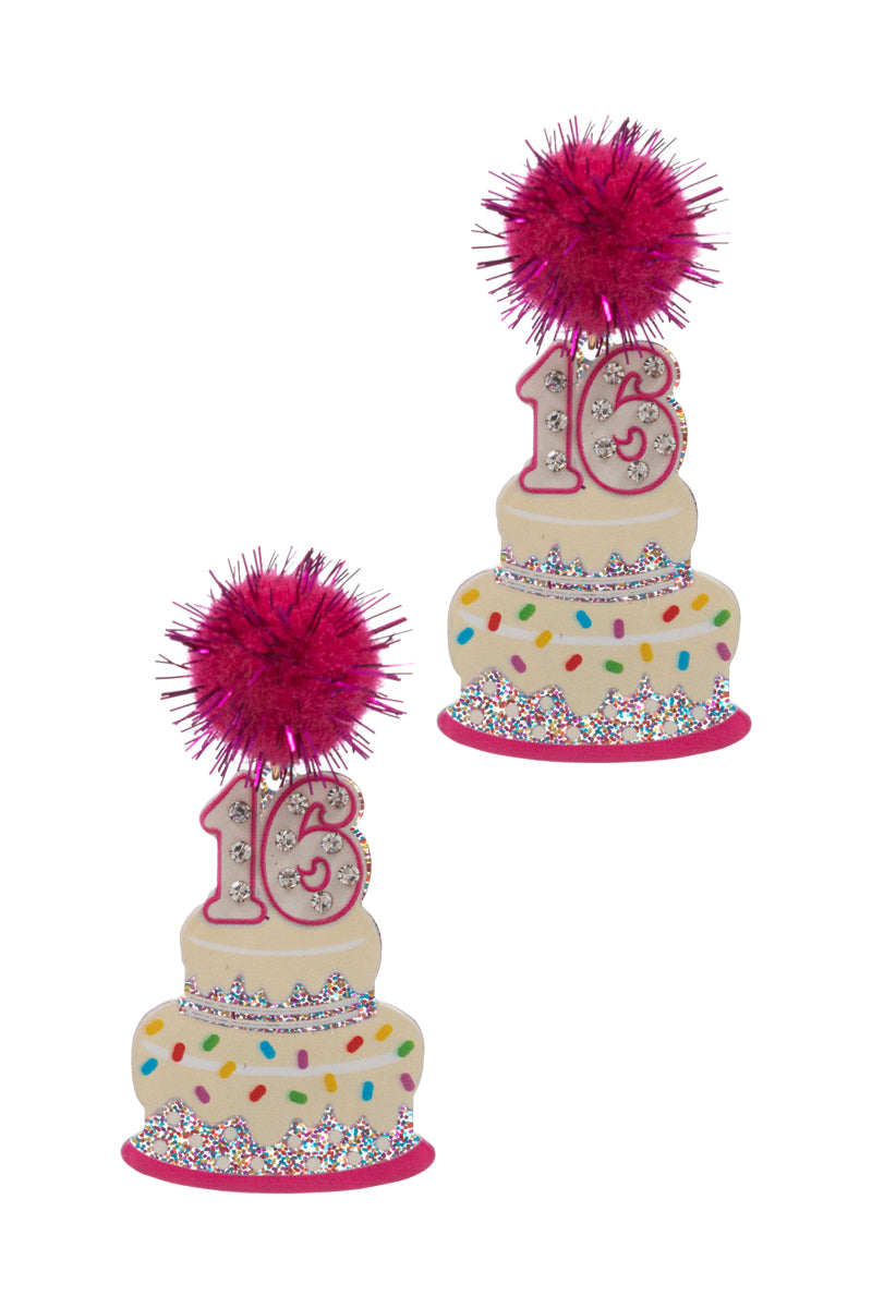 Celebrate in style with our 2.5 inch Sweet 16 birthday cake shaped post earrings! Made of printed glitter resin, these earrings add a touch of sparkle to any outfit.