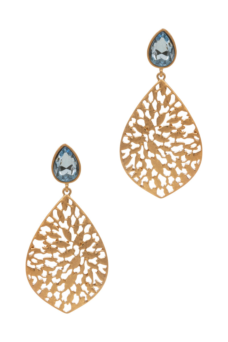 This vintage-inspired filigree metal post earring features a stunning 2.75 inch teardrop shape and is adorned with an epoxy stone at the top for an elegant touch.