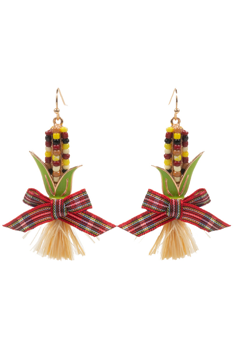 Thanksgiving Corn Bead Raffia Tassel Hook Earrings