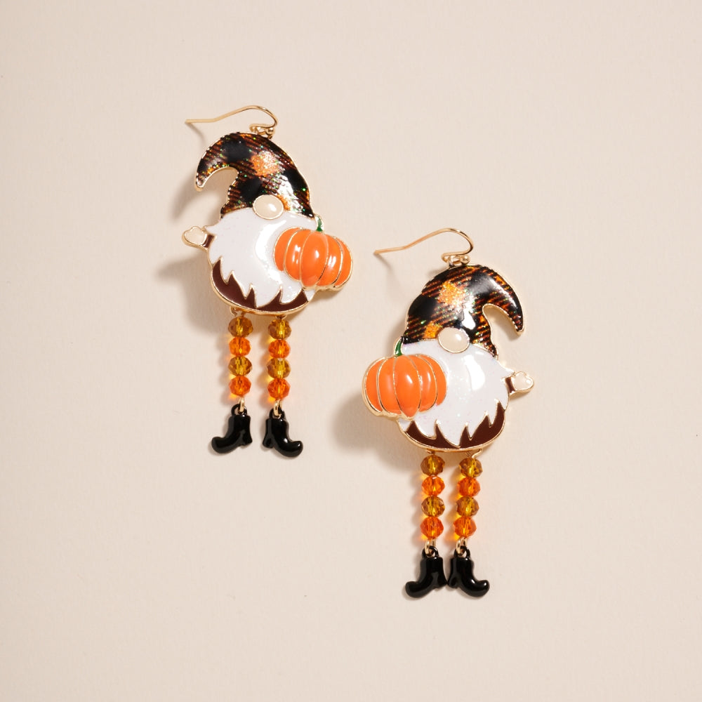 Bring some fall magic to your accessories with these adorable gnome and pumpkin hook earrings. A great seasonal statement.