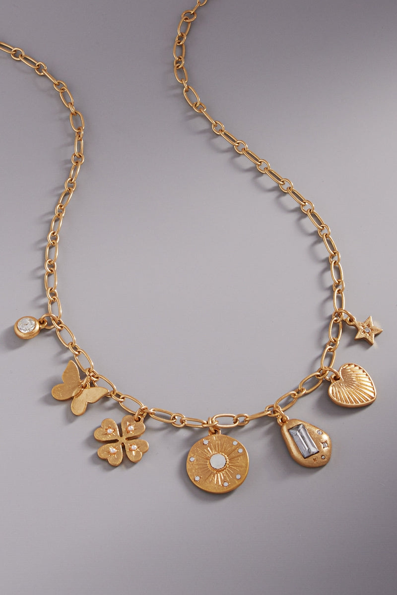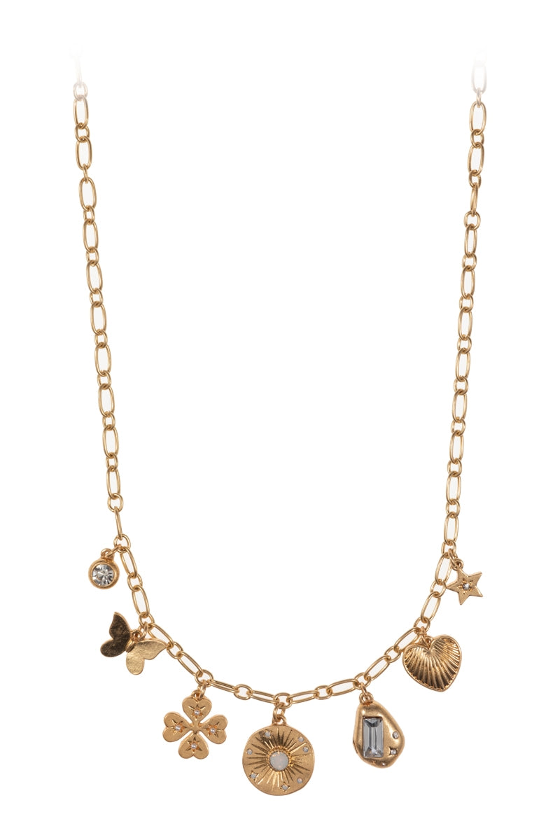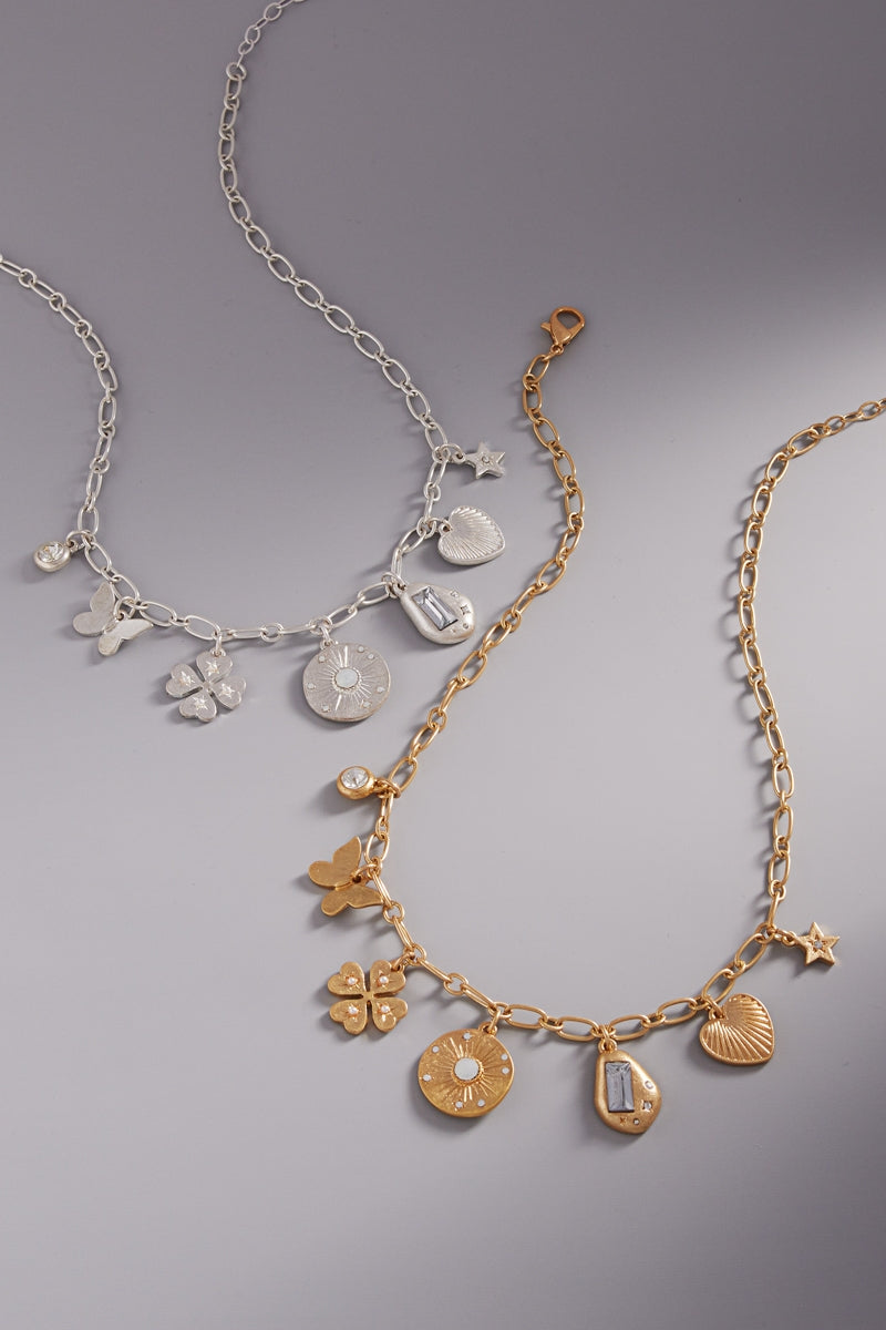 Introducing our 16 inch vintage disk, heart, clover, and butterfly shaped charm necklace! Made from high-quality metal, this mix of charms adds a unique touch to any outfit. With a short length, it's perfect for everyday wear. Upgrade your jewelry collection with this versatile and stylish necklace.