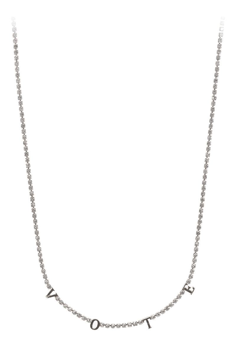This vote-shaped metal necklace measuring 16 inches features a rhinestone chain, adding just the right amount of sparkle to your outfit. Show your support for democracy and accessorize in style.