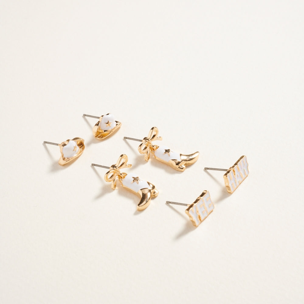 Celebrate your Western spirit with this mixed cowgirl earring set. With three unique designs, you can switch up your look from casual to rodeo-ready in seconds.