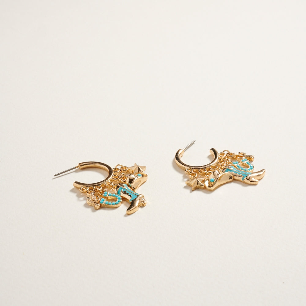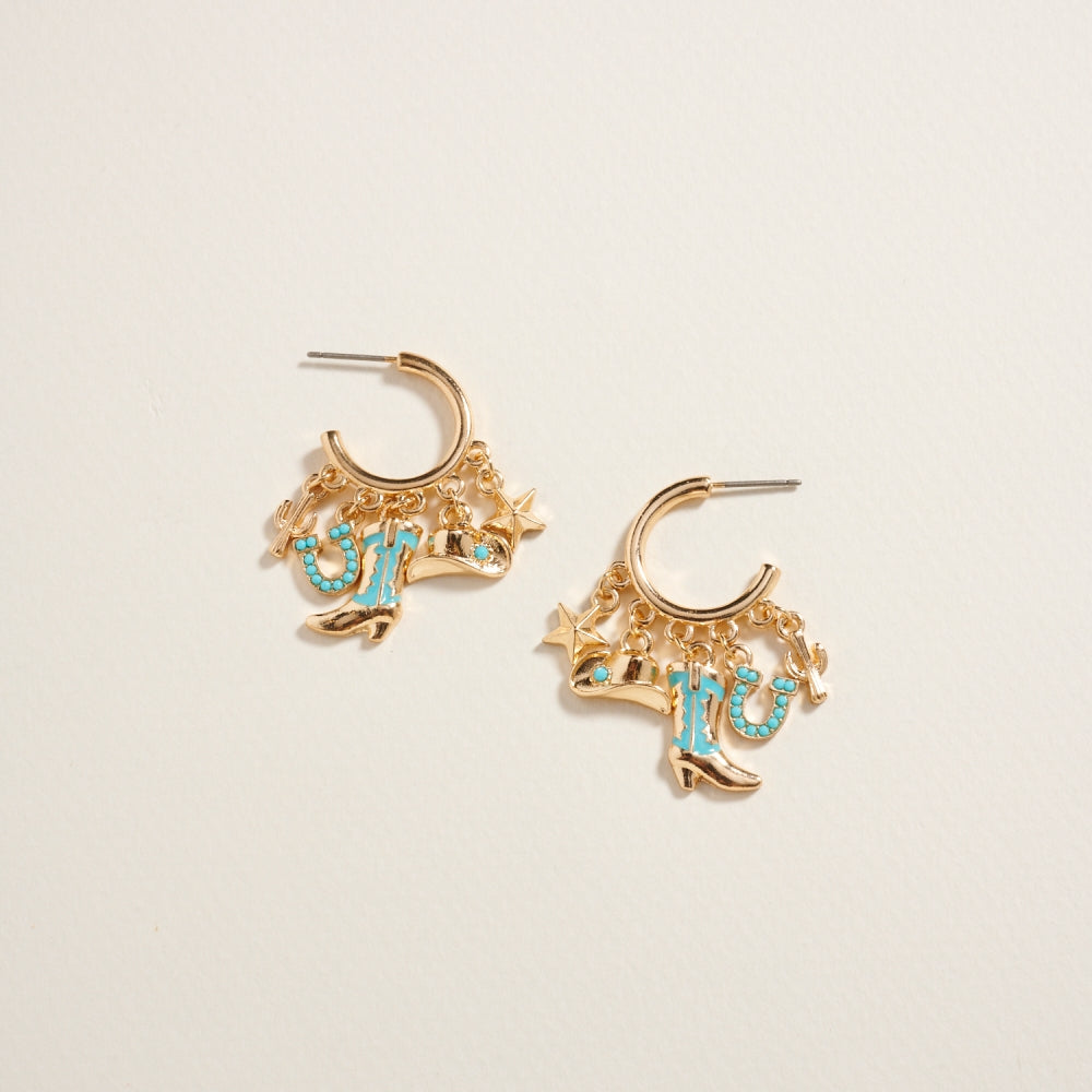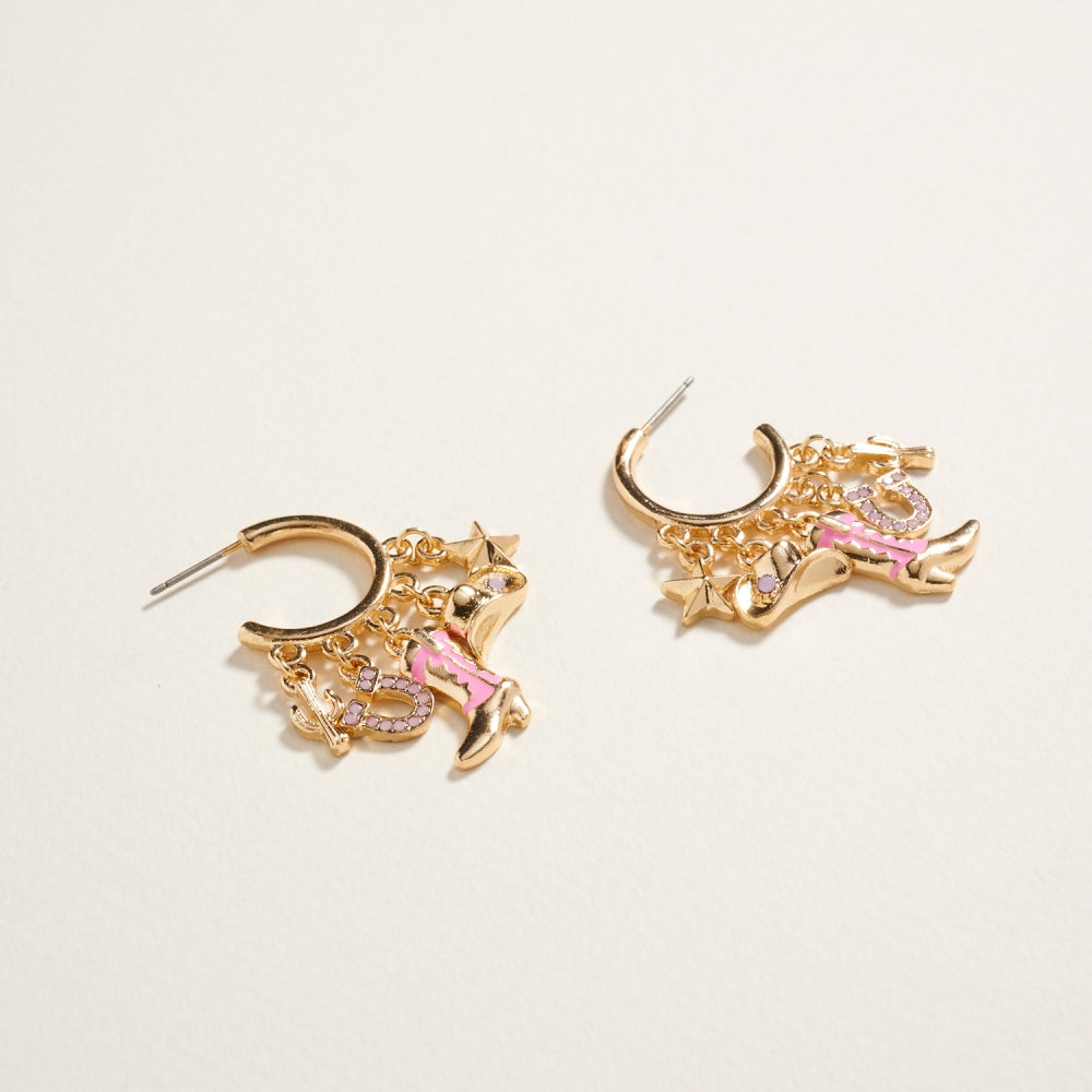 Show off your cowgirl spirit with these Western hoop earrings featuring a mix of playful charms. A bold accessory perfect for rodeos, concerts, or everyday country style.